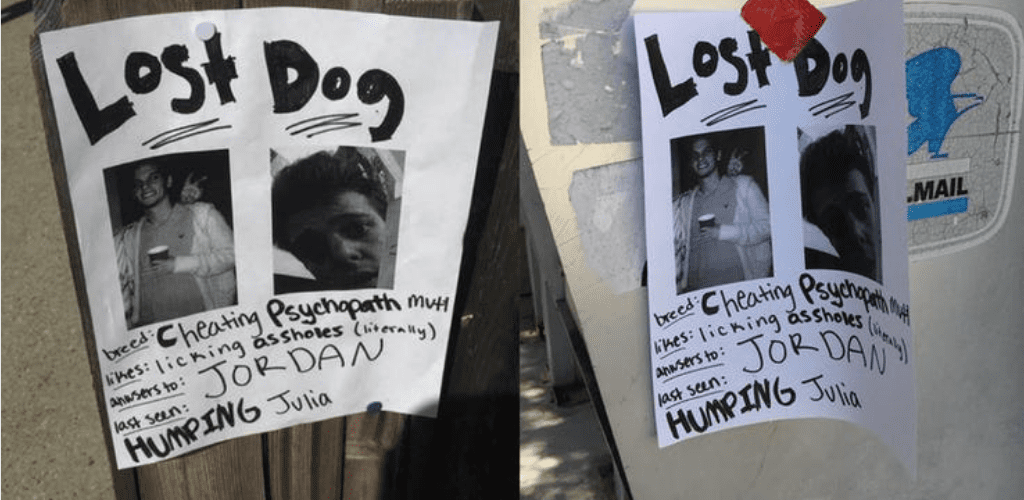 A veces la gente está feliz de perder un perro. No el peludo perro de cuatro patas, sino a los hombres que actúan como perros (sin ofender a los perros). Después de que una niña de la universidad descubrió que su novio estaba probando con otras chicas, publicó estos carteles de “perros perdidos” por todo el campus, explicando con gran detalle su salud mental y sus preferencias sexuales.