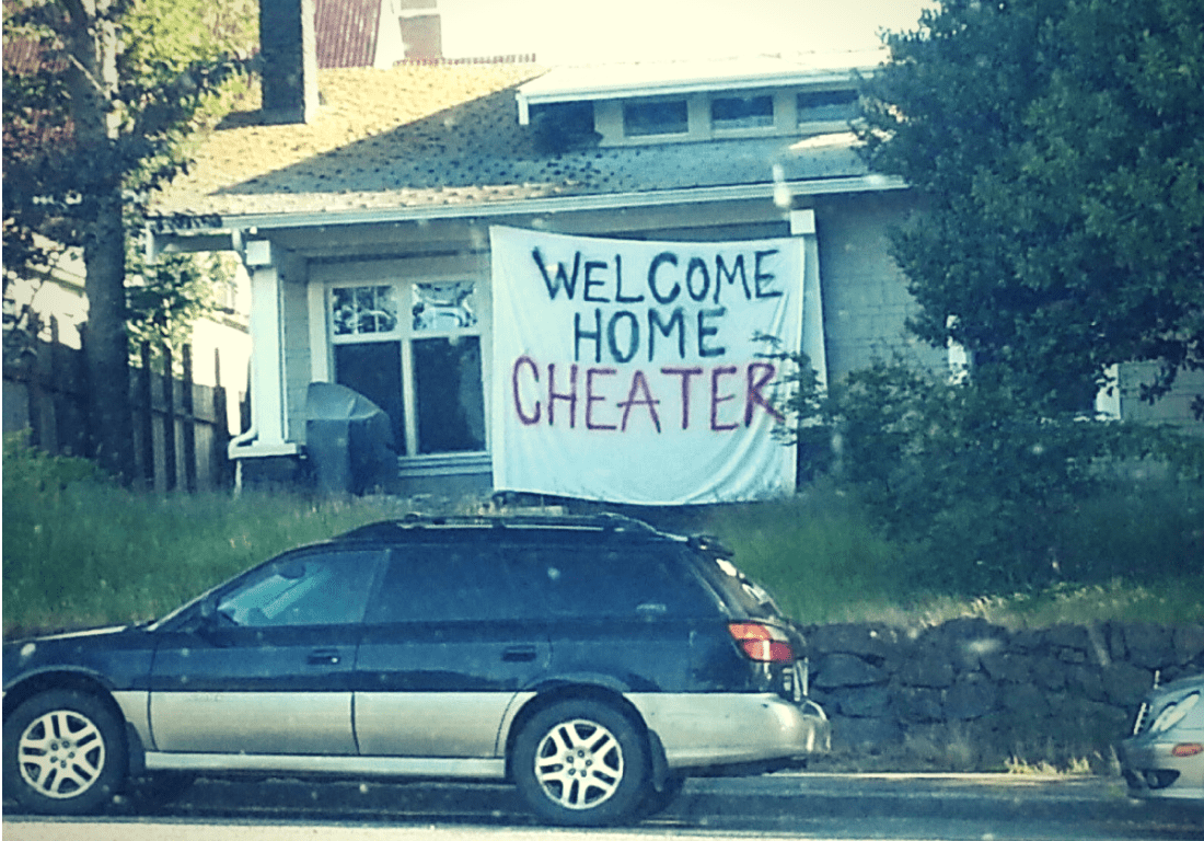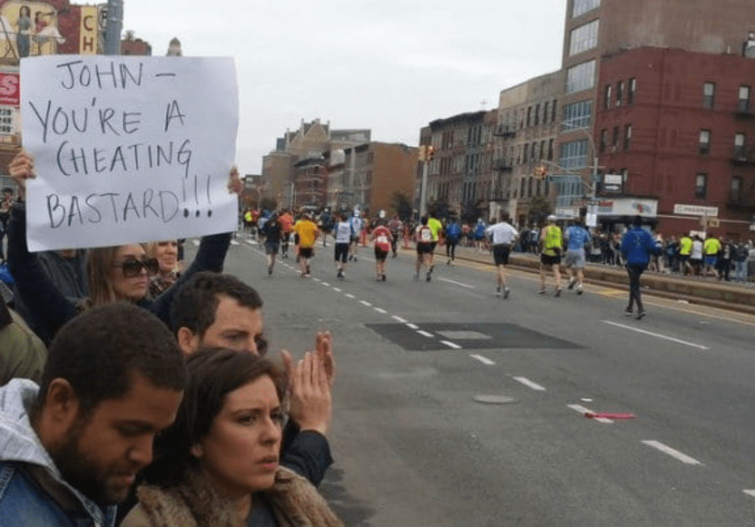 Engañar a tu esposa nunca se podría llamar como una “buena idea”. Pero incluso, es aún más estúpido seguir invitándola a los eventos públicos en los que estas involucrado, cuando sabes que podrían descubrirte. Eso es lo que este tipo podría aconsejarle, a cualquier otro posible infiel. Ya que su esposa dejó caer la bomba públicamente y reveló que su pareja la traicionaba sosteniendo un poster enorme de cartulina. Ella sostenía el cartel, mientras esperaba a que él corriera a través de la línea final del maratón. Incluso si llegaba de primero, su esposa quería hacerle saber que en realidad, iba en el último lugar.