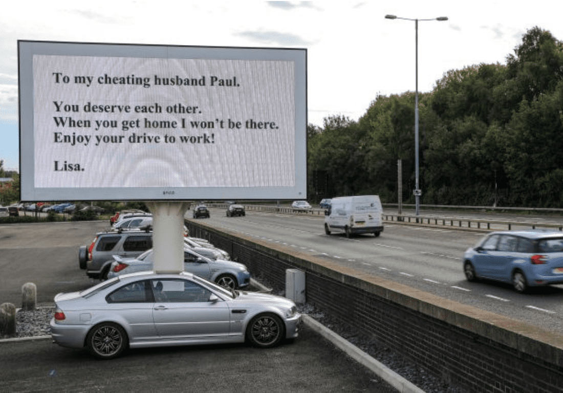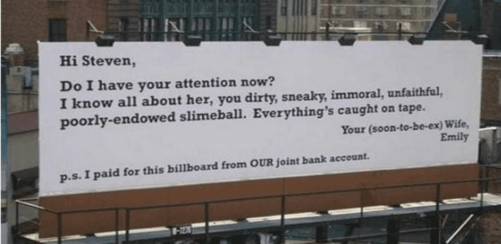 A veces, para vengarse de tu pareja traicionera vale todo… incluyendo la cuenta bancaria. En caso de que te lo preguntes, los alquileres de vallas publicitarias van desde $11.000 a $ 23.000. Aunque ahora estás en bancarrota y tu falta de amplitud es explotada, la buena noticia es que el alquiler durará aproximadamente un mes, por lo que estamos seguros de que Steven y todos los demás en la región recibirán el mensaje.