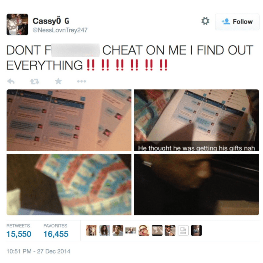 Si estás engañando a tu pareja, es posible que no quieras hacerte ilusiones cuando llegue la Navidad. Cassy se enteró de que su novio había estado intercambiando algún material picante con otra chica a través de Twitter. Ella hackeó su cuenta e imprimió cada uno de los mensajes y se lo dio a él en Navidad. Desafortunadamente, no tuvo el mismo efecto que ella pensó que haría con él diciendo: “podrías haberme mencionar (ado), lo habría re-twiteado con gusto”. Supongo que sabemos que tienes algo de karma en tu camino…