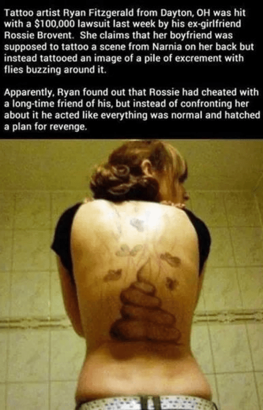 Si vas a hacerte un tatuaje de tu novio, asegúrate primero de que él no sepa que lo has estado engañando. Esta chica descubrió el camino difícil cuando intentó demandar a u ex por tatuarle una enorme y humeante pila de basura con moscas e n la espalda, en lugar de la escena de Narnia que había mencionado. Rossie no sabía que su novio, Ryan, había descubierto que ella lo estaba engañando. Como él le hizo firmar una licencia creativa para hacerse el tatuaje, ella perdió la demanda quedándose con el tatuaje.