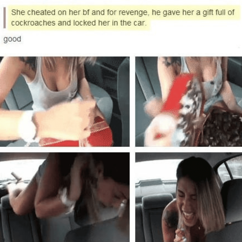 Si una persona va a hacer trampa, debe estar preparada para la venganza que su amante despreciado podría tratar de eliminar. Esta chica no tenía idea de que había sido descubierta por lo que realmente es por su novio. Entonces, decidió vengarse a través de una caja de “chocolates” que en realidad resultó ser una cantidad insana de cucarachas, y la encerró en el auto para disfrutar su “regalo”.