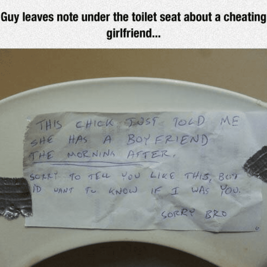 A veces la venganza te da una patada en el trasero por detrás. Si te vas a juntar con alguien que te acompaña, es mejor que al menos seas honesto con ellos , si no con tu cónyuge. Cuando este chico descubrió que la chica con la que se había acostado no le dijo que estaba en una relación, ¡se aseguró de pegar una pequeña nota de pena en el fondo del asiento del inodoro para que su novio la encontrara!