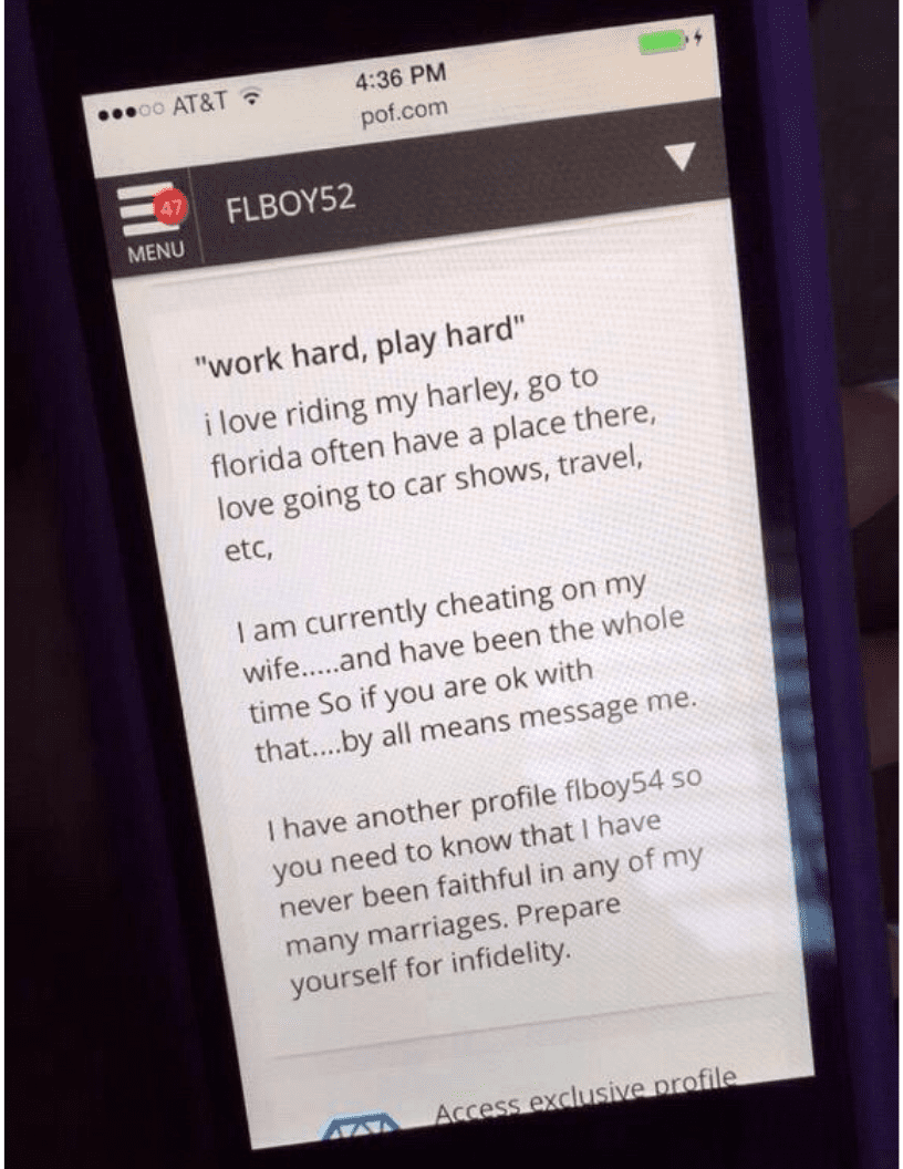 Las personas que engañan a sus otros significativos a través de aplicaciones como POF y Tinder deberían casi siempre ser atrapadas. Literalmente están compilando una base de datos completa de evidencia de su infidelidad. Entonces, cuando su amante se entera y cambia su perfil para reflejar con mayor precisión quiénes son, ¡no debería sorprender!