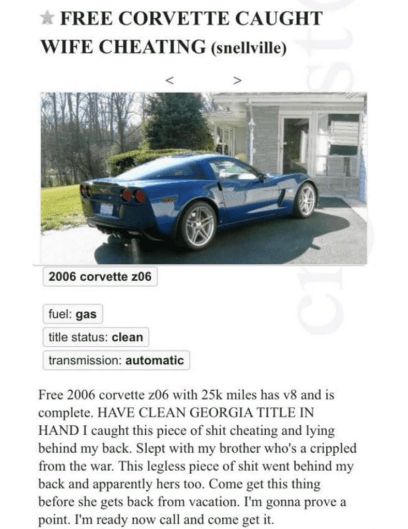 Gratis Corvette 2006 z06, con 25k millas, tiene v8 y está complero. TIENE EL TÍTULO LIMPIO A LA MANO. Obtuvo este pedazo de basura traicionando y mintiendo a mis espaldas. Durmió con mi hermano, quien es un veterano de guerra inválido. Este pedazo de estiércol sin piernas lo hizo a mis espaldas y aparentemente ella también. Ven por esto antes de que ella regrese de vacaciones. A toda prueba. Listo, llama ahora y ven por él”.