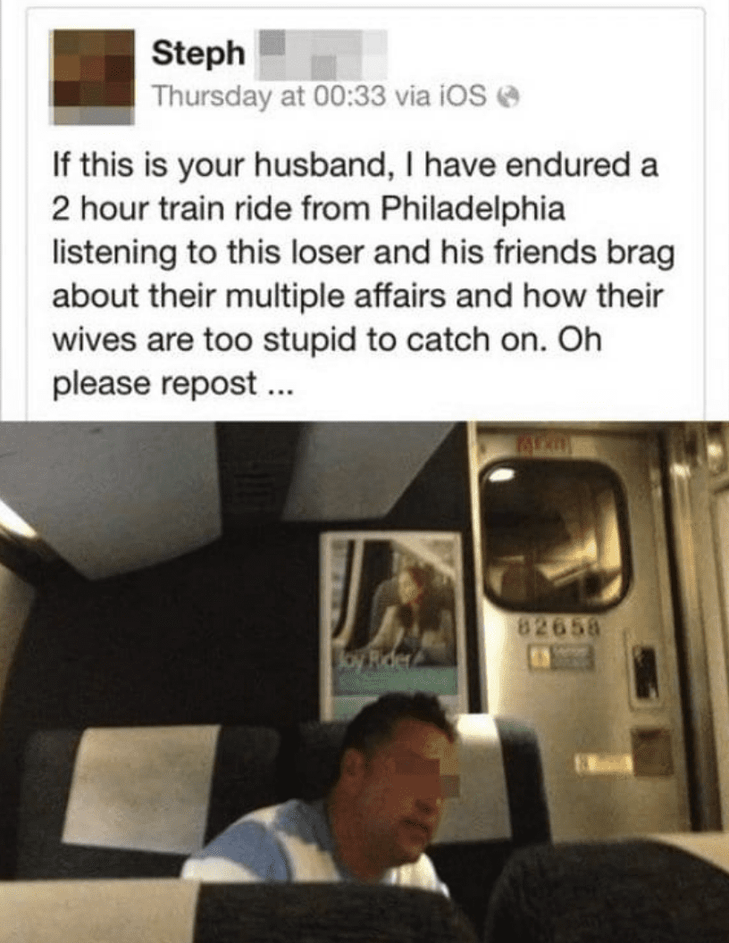 “Si este es tu esposo. He soportado 2 horas en un tren desde Philadelphia escuchando presumir a este perdedor y a sus amigos, sobre varias aventuras y cómo sus esposas son demasiado estúpidas para no darse cuenta. ¡Oh por favor, republíquenlo!”.