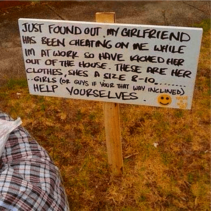 “ Me acabo de enterar de que mi novia me estaba engañando mientras yo trabajaba, así que la he echado de casa. Chicas (o chicos, cualquiera que sea su inclinación)… esta es su ropa, ella es talla 8-10… Ayúdense ustedes mismos. ¡Qué tengan un buen día!”.