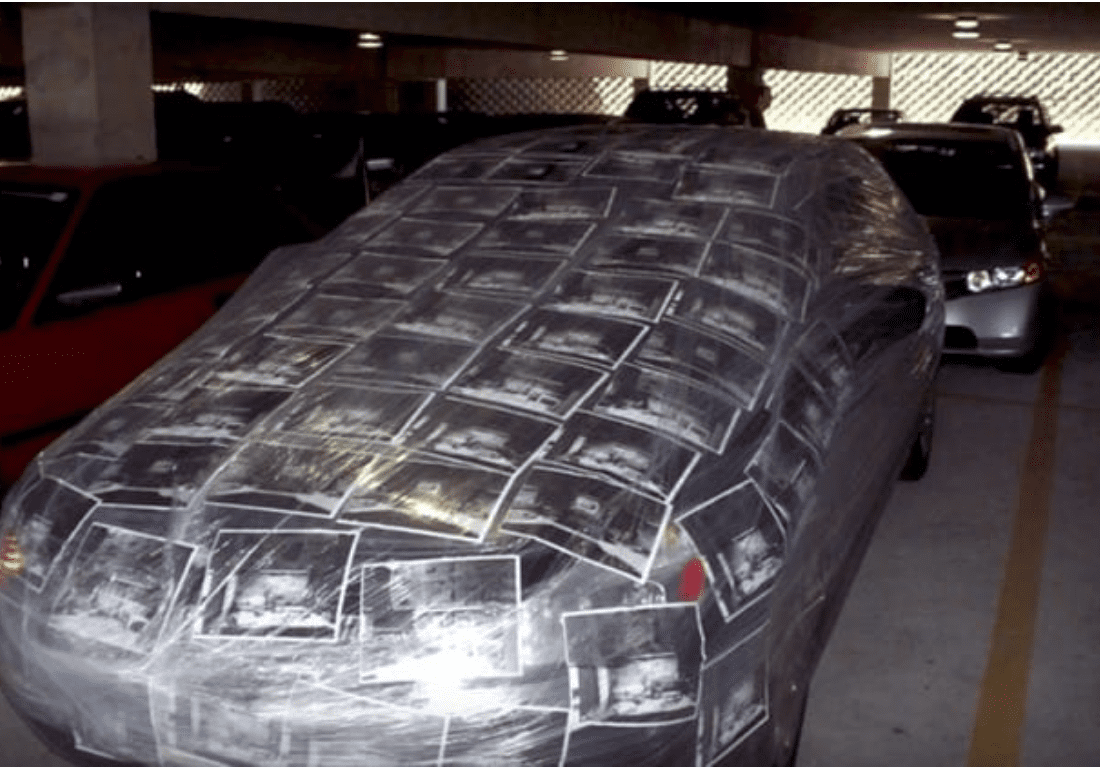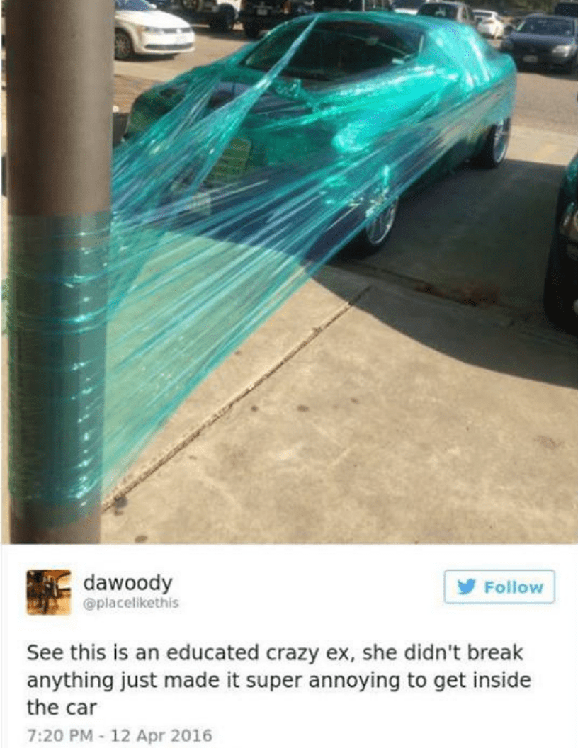 Con todas las maneras que existen hoy en día para demandar a alguien, a veces la ruta más segura para vengarte de una persona es hacerle una broma. En vez de ir a la cárcel por vandalismo, cuando esta mujer descubrió que su compañero la engañaba, ella simplemente cubrió todo su automóvil con papel para envolver. Una gran cantidad de envoltorio aferrado a un poste.