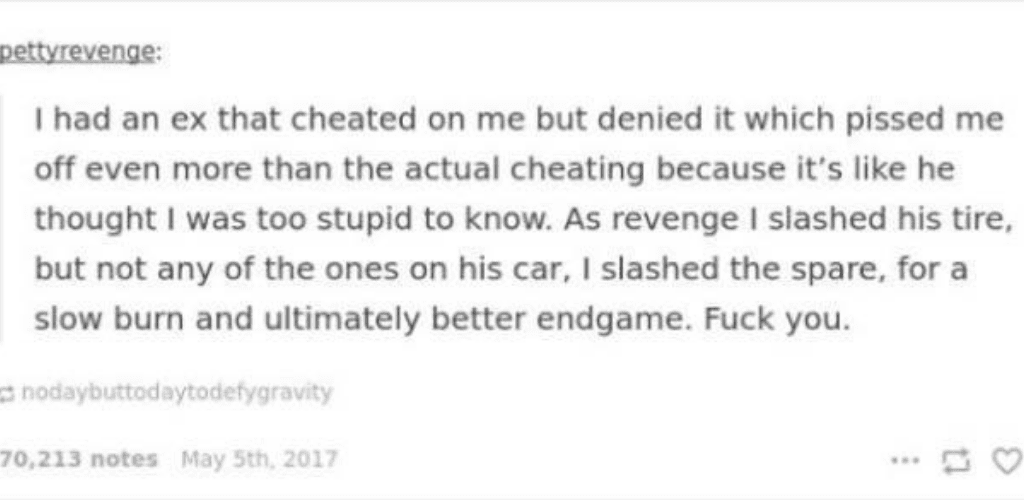 “ Yo tuve un ex que me engañó, pero me negó que lo hizo. Y eso me molestó aún más que la propia infidelidad, porque él pensó que yo era una tonta que no sabía nada. Como venganza, yo corté uno de sus neumáticos: el de repuesto, para que le ardiera lentamente y en última instancia, tuviese un mejor final. Púdrete”.