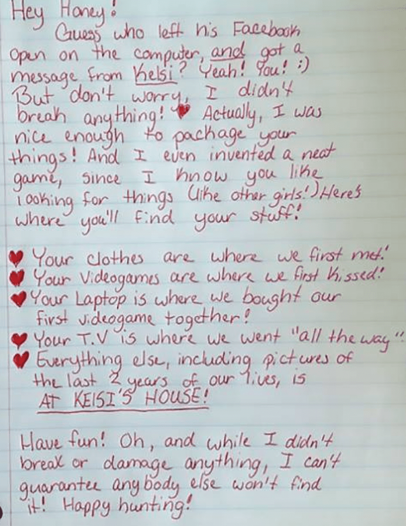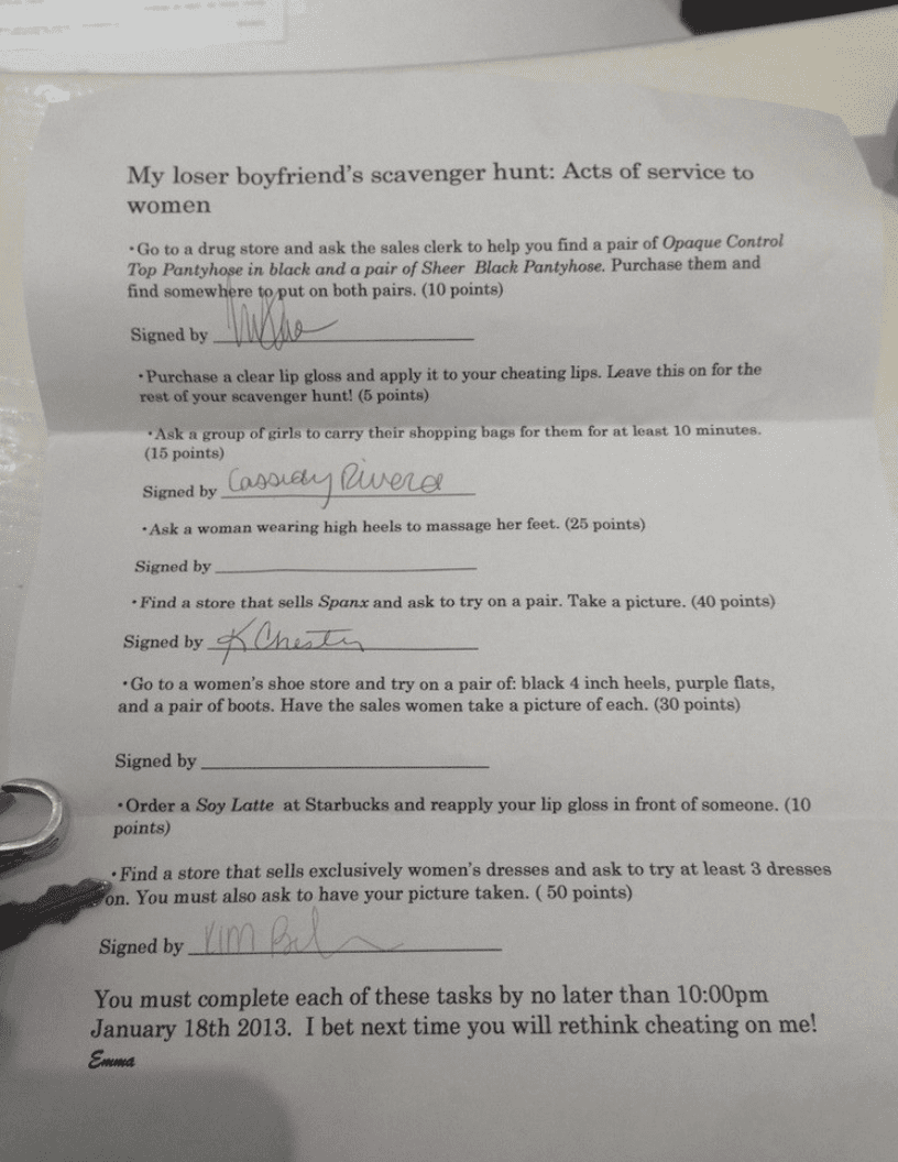 Uno de los primeros sentimientos que sobresalen, después de darse cuenta de que tu pareja te ha estado engañando es la humillación. Por eso, es justo que se les acabe la fiesta a esos infieles con el mismo horrible sentimiento, pero tienes que ser creativo si quieres pegarles en dónde más les duela. Esta mujer lo entendió muy bien cuando organizó esta humillante búsqueda del tesoro, cuyas tareas tenían que ser firmadas por testigos.