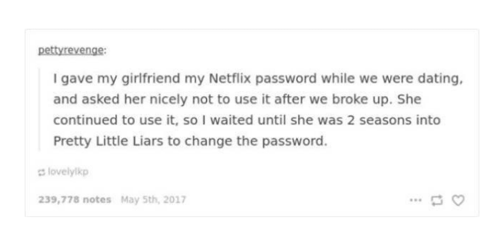“Mientras estábamos saliendo, le di a mi novia la contraseña de mi cuenta en Netflixt y después de que rompimos, le pedí amablemente que no la usara. Como ella continuó utilizándola, esperé a que llegara a la segunda temporada de Pretty Little Liars para cambiar la contraseña”.