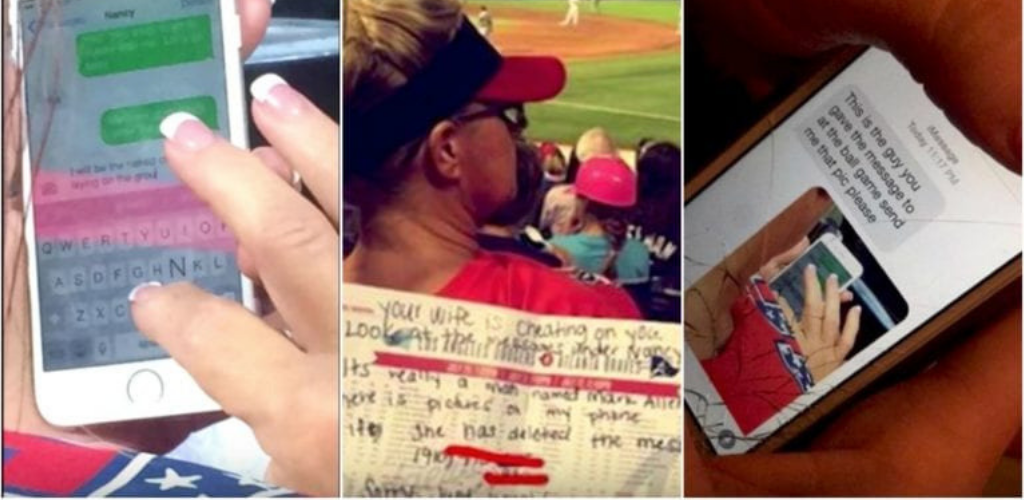 De pronto se dieron cuenta de que la señora estaba escribiéndose mensajes calientes con otro hombre, mientras estaba acurrucada junto a su marido. Ellas decidieron pasarle una nota al señor, diciéndole que a la salida le mirara los mensajes de textos que le enviaban a “Nancy”. Además, le tomaron algunas fotos a la escandalosa conversación, para así tener las pruebas para cuando él llamara al número que le dejaron en la nota.