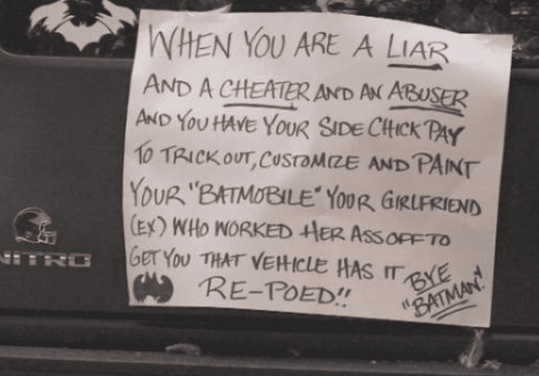 “Cuando eres un mentiroso, infiel y abusador, y tienes una chica engañada a tu lado para pagar, personalizar y pintar tu “bat-teléfono”, y a tu novia (ex) quien trabajó con mucho esfuerzo para conseguirte ese vehículo. ¡Lo volviste a arruinar! Adiós Batman.”