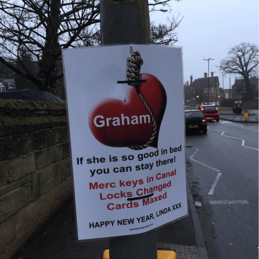 Si has construido tu vida con una persona y tienen muchas cosas de valor (como costosos automóviles) deberías pensarlo dos veces antes de ser infiel. Si te burlaste de tu pareja engañándola con alguien más, no hay nada que le impida tomar lo que más aprecias. ¡Linda entendió cómo golpear a su ex Graham, en dónde realmente le dolería! Lanzó al canal las llaves de sus autos, gastó todo el dinero que había en las tarjetas comunes y cambió las cerraduras. Estamos casi seguros de que, probablemente, Graham no tendrá un buen año nuevo. “Graham Si ella es tan buena en la cama, puedes quedarte ahí. Las llaves están en el canal, cambié las cerraduras, las tarjetas están al tope. Felíz año nuevo, Linda.”