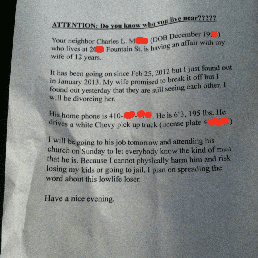 Tu vecino Charles L. Mxxx , quien vive en 2%$ de la calle Fountain, está teniendo una aventura con mi esposa desde hace 12 años. Ha estado ocurriendo desde el 25 de febrero del año 2012, pero yo los descubrí en enero de 2013. Mi esposa me prometió que se separarían, pero ayer encontré que ellos se siguen viendo y estando juntos. Yo me voy a divorciar de ella.
