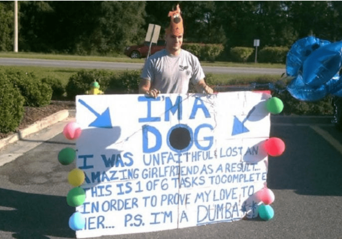 “Yo soy un perro, por ser infiel perdí una novia increíble. Como resultado de eso, esta es 1 de las 6 tareas que debo completar para probarle a ella mi amor. Posdata: Soy un imbécil”.