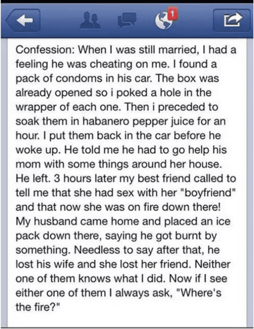 “Confesión: Cuando estaba casada, tenía el presentimiento de que me estaban engañando. Encontré un paquete de preservativos en su auto. La caja ya estaba abierta, así que a unos cuantos les hice un par de agujeros. Luego, procedí a sumergirlos por una hora en salsa picante. Él me dijo que tenía que ir a ayudar a su mamá con algunas cosas en su casa. Se fue y 3 horas después mi mejor amiga me llamó contándome que había tenido sexo con su “novio” y que ahora, a ella le ardía todo por allá abajo. Mi esposo regresó a casa y me dijo que se había quemado con algo, así que se colocó hielo en su parte íntima. No hace falta decir que después de eso, él perdió a su esposa y ella a su mejor amiga. Tampoco, que ninguno de los dos contó lo que habían hecho. Ahora cada vez que los veo, les pregunto ¿en dónde está el fuego?”.