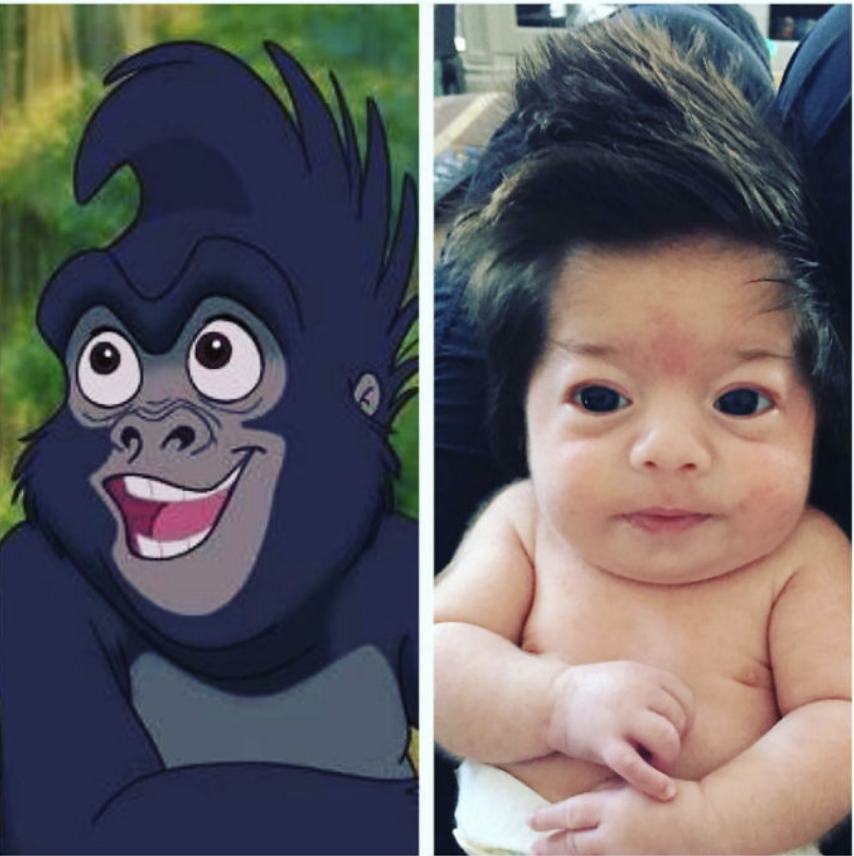 ¡Mucho cabello en la cabeza de esta bebé! Se parece a Terk de Tarzán. Como un pequeño bebé gorila.