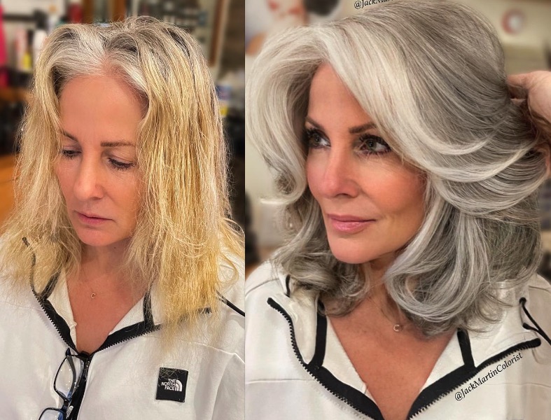 The outcome is a more natural look compared to the stark gray-white hair style.