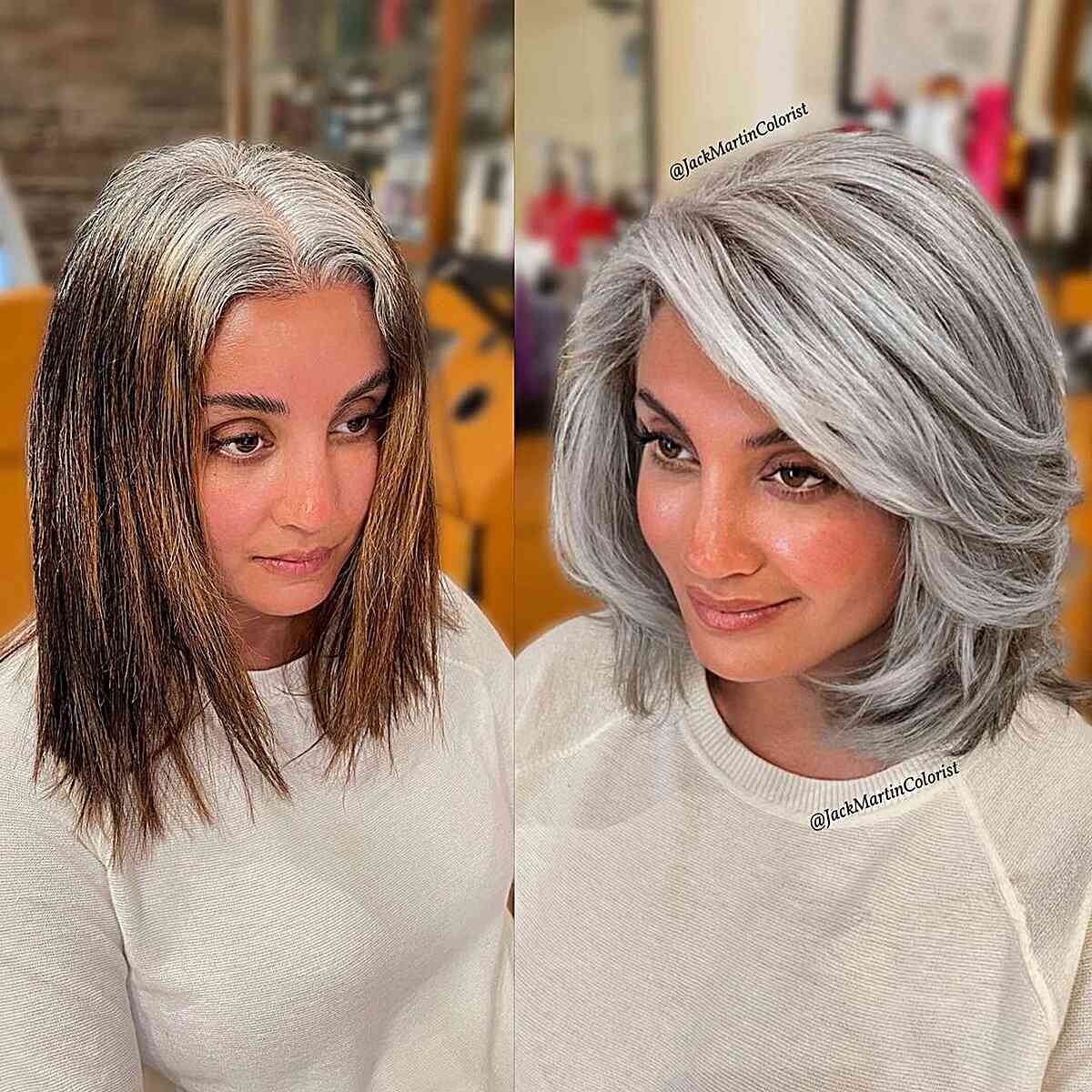An all-over gray-silver makeover is a stunning choice that can elevate your silver gray hair color to a whole new level of lusciousness. This transformation allows you to fully embrace the elegance of silver hair and create a harmonious and captivating look.