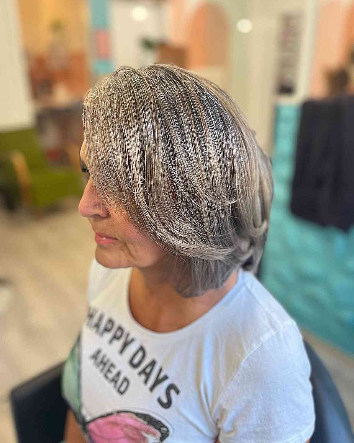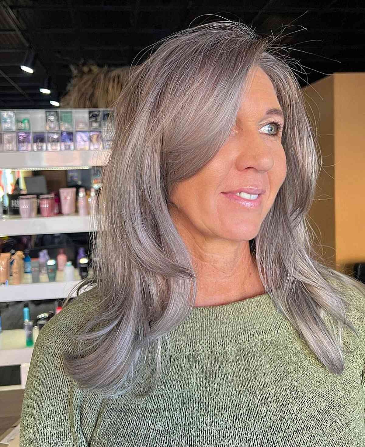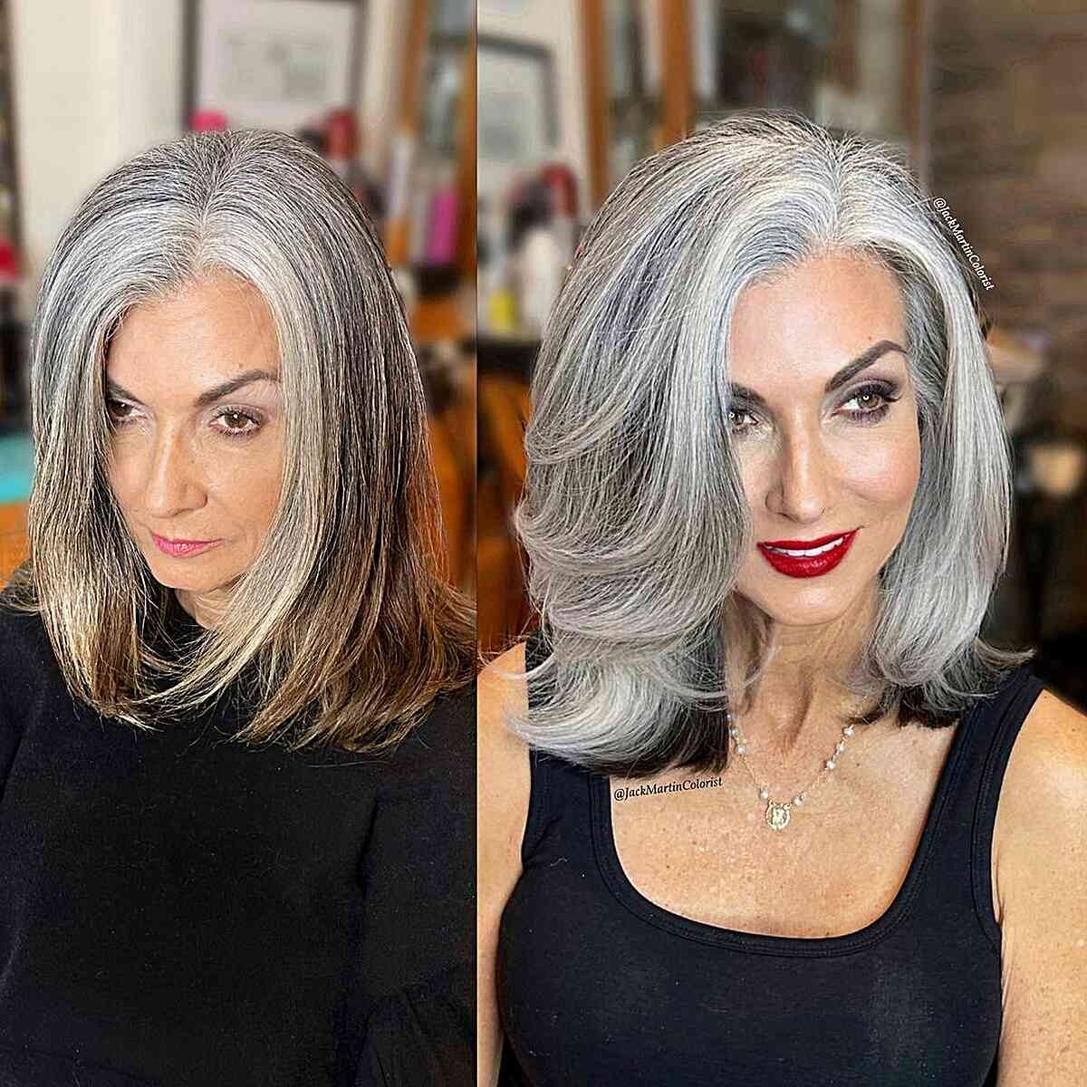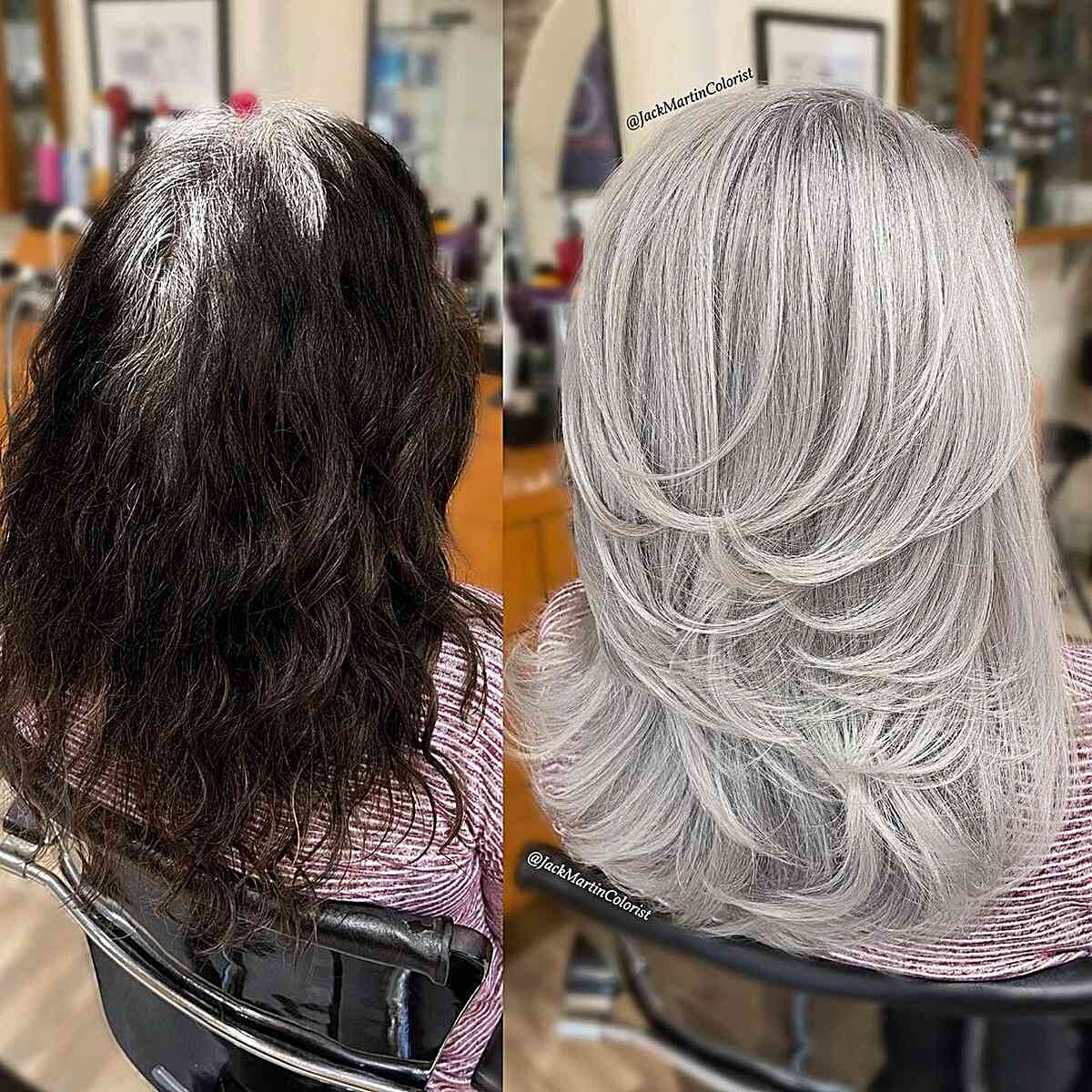 Transform your gray hair into a striking and beautiful look by introducing ashy color and feathered layers. This youthful hairstyle accentuates the captivating depth often present in gray hair, providing a chic and elegant appearance.