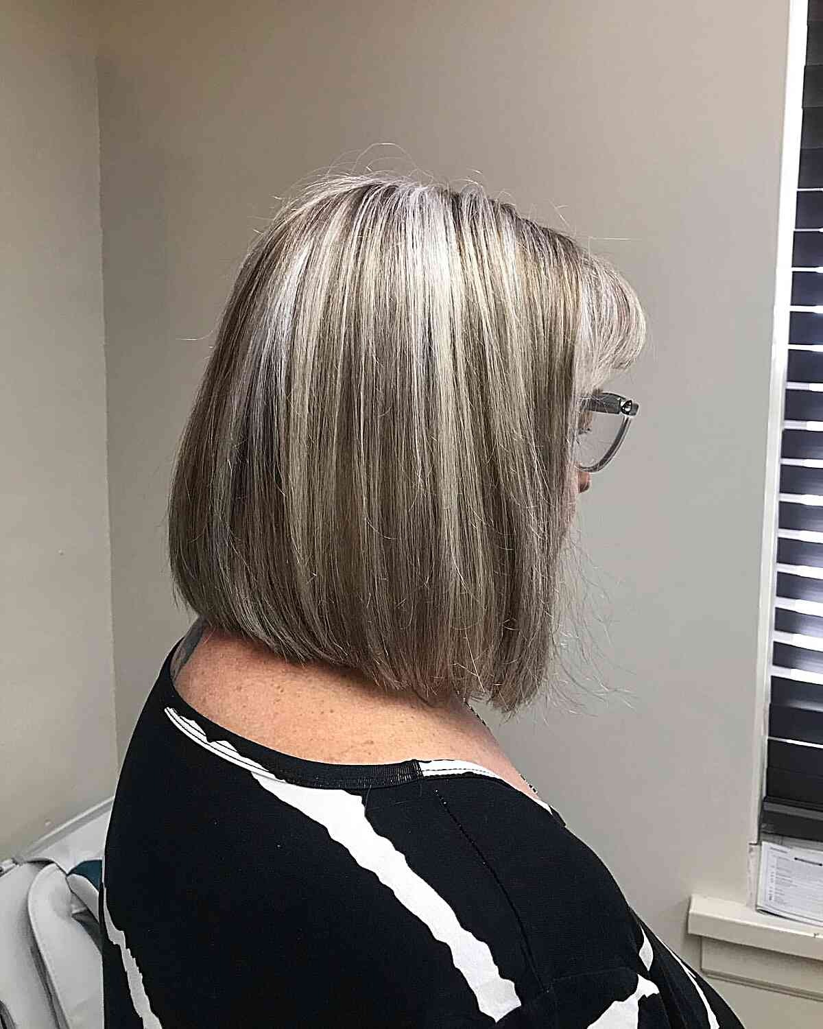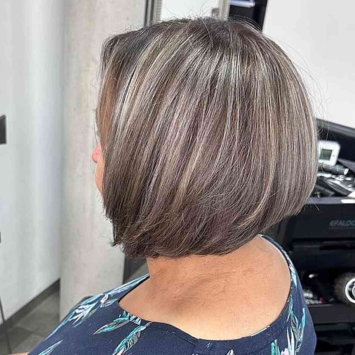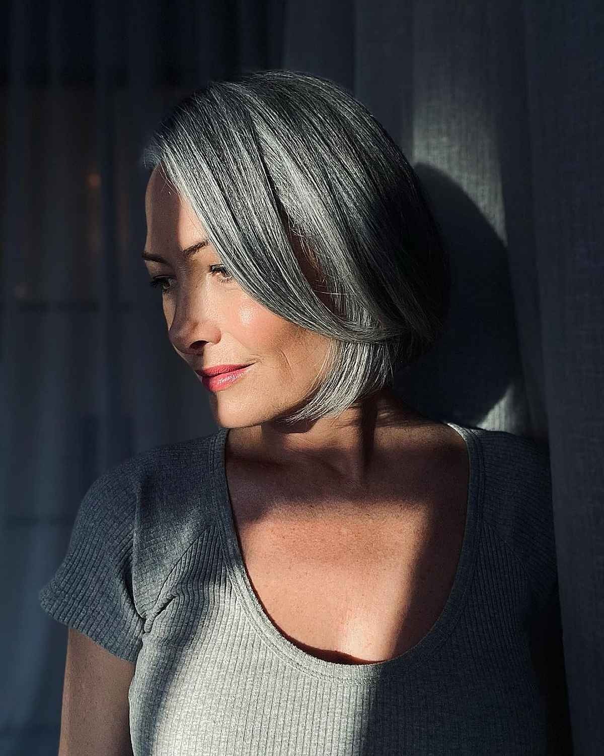 Experiment with a dimensional short bob featuring grey highlights for a chic and trendy hairstyle. The gentle tonal variations in gray hues add contrast and depth to your hair. This style combines elements of a classic short bob with a subtle curve at the nape of the neck. The blend of grey highlights and the soft bob shape is a popular choice among those seeking a contemporary yet timeless hairstyle.