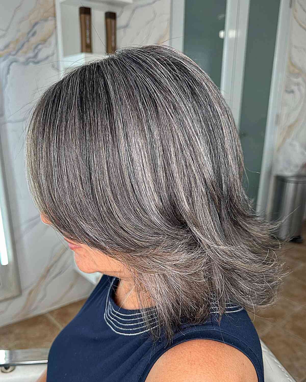 Grayish mushroom brown hair with upturned tips is a fashionable choice for older women seeking a fresh look. Elevate your gray hair by incorporating highlights and infusing a silvery gray tone to complement your mushroom brown base. This combination will yield a luxurious and ashy blend of colors that’s both contemporary and stylish.