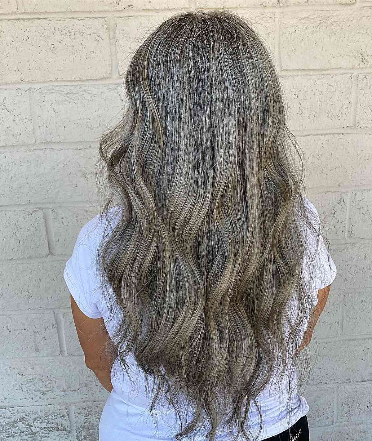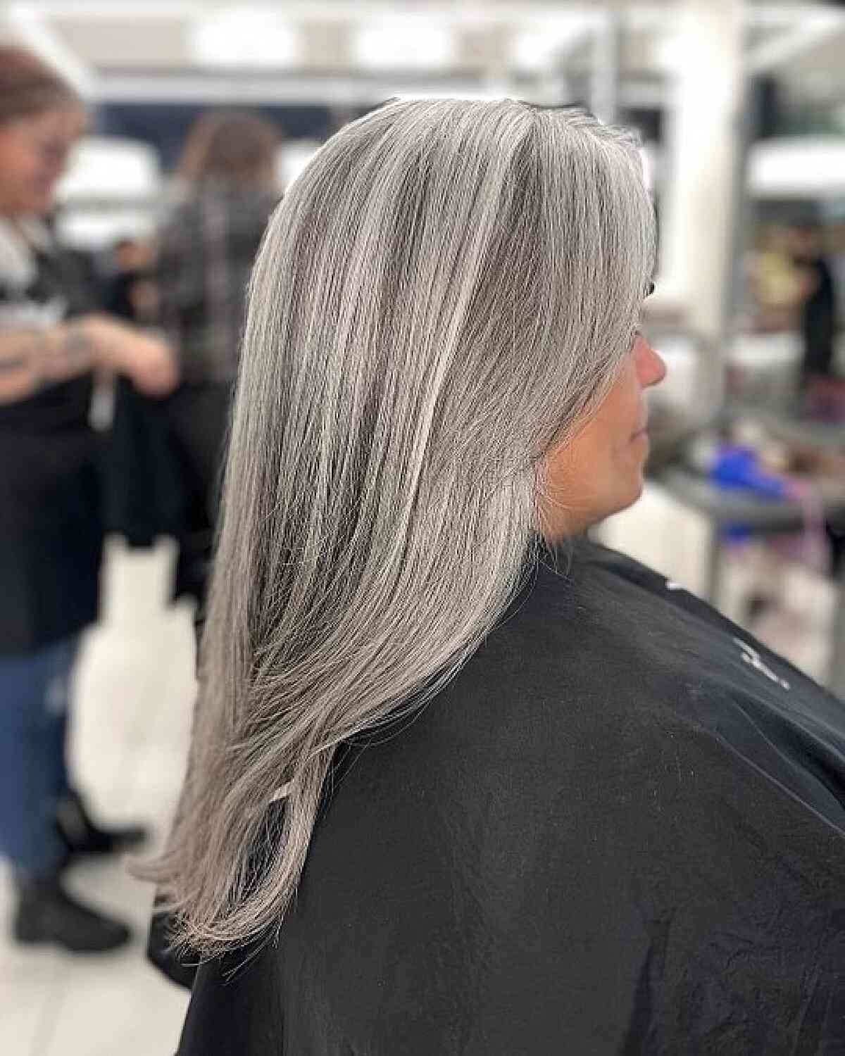 Elevate the allure of your medium to long hair with a captivating salt-and-pepper color scheme. If you have natural gray strands, incorporating silvery highlights can beautifully enhance your existing shades. To keep this style looking its best, maintain it with ease by keeping a purple shampoo on hand at home. This specialized shampoo will assist you in maintaining and refreshing the tone of your salt-and-pepper hair.