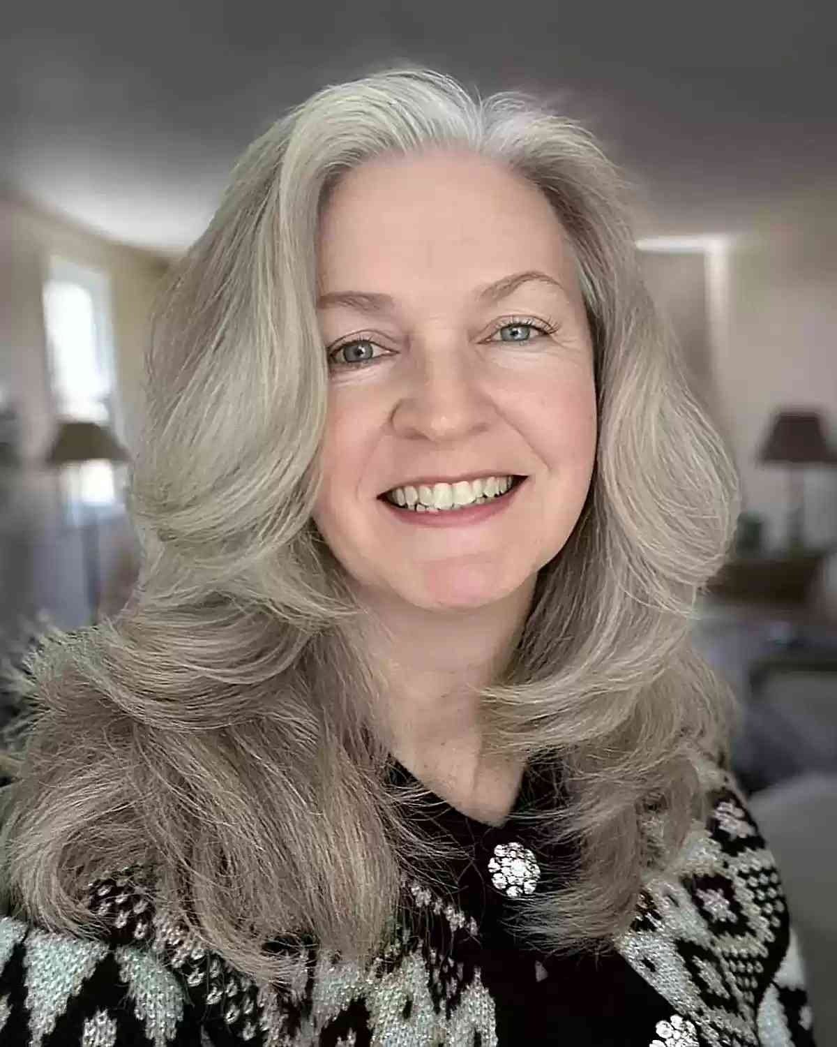 Enhancing gray hair with silver and muted purple undertones can be a splendid choice for older women with layered hair. Updating your gray hair color doesn’t have to be monotonous. A skilled stylist can assist you in selecting a shade that complements your skin tone, resulting in a sophisticated and chic appearance. To maintain this look, you may need to visit the salon for touch-ups every 6 weeks to keep the color fresh and vibrant.