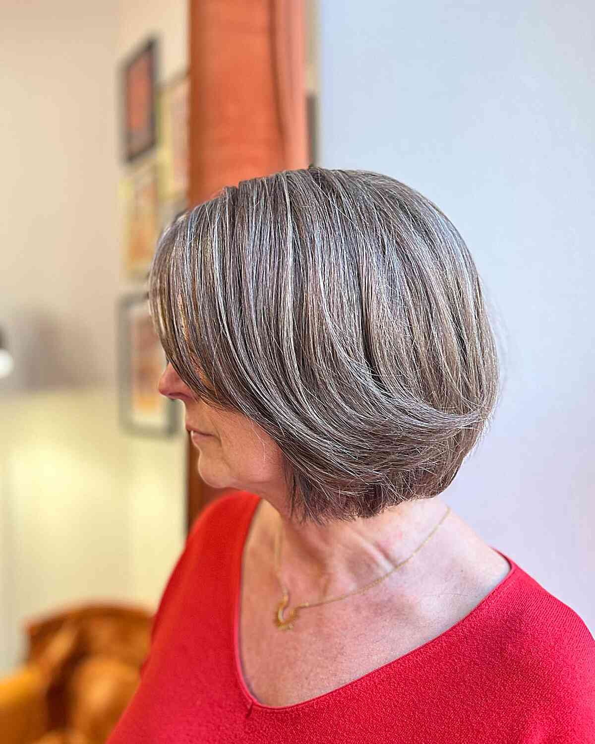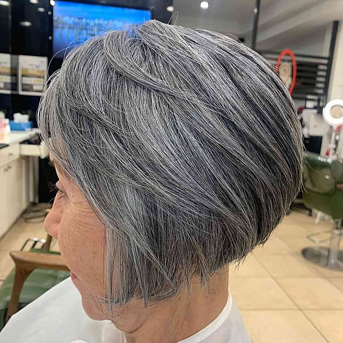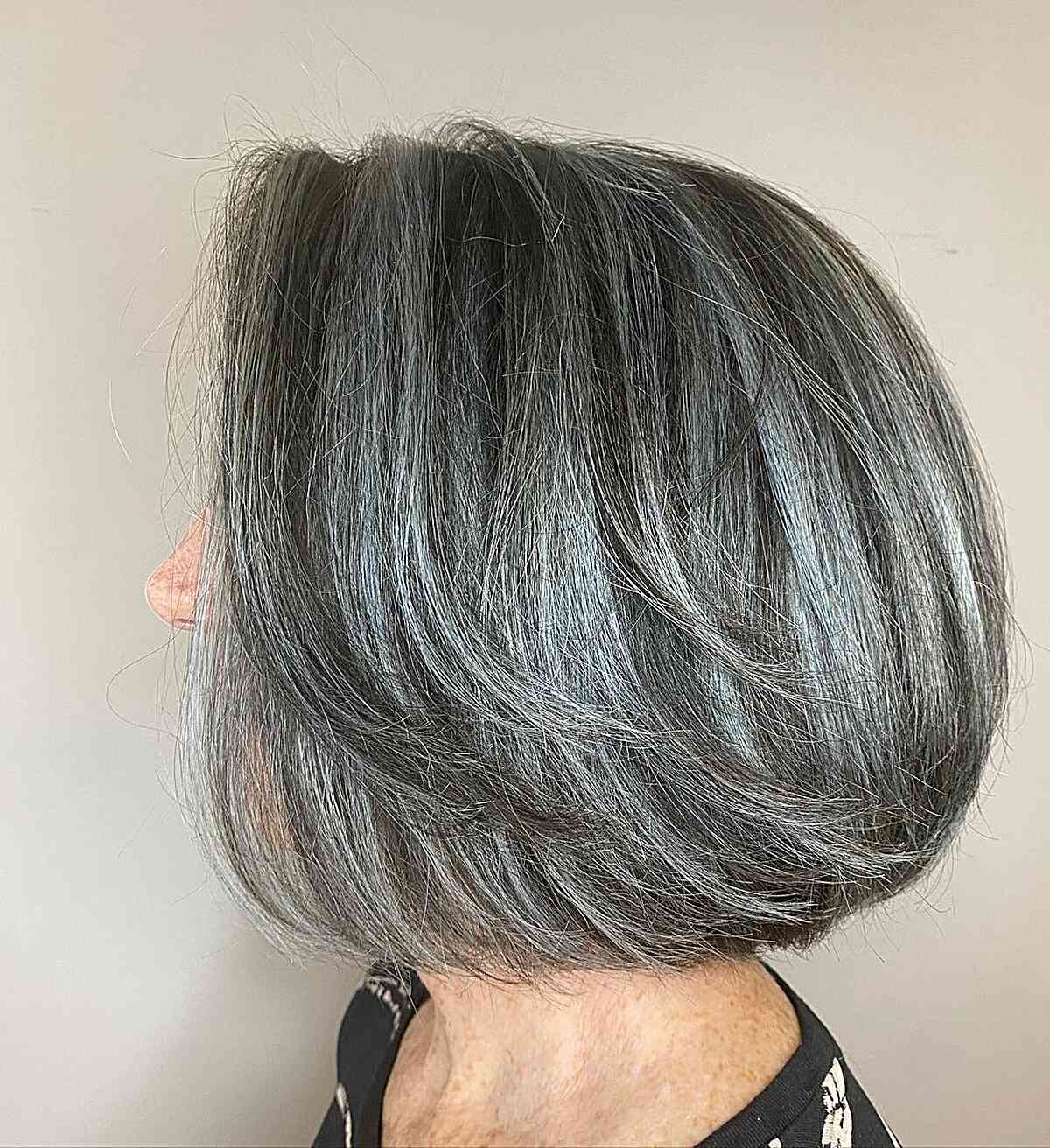 Opting for a classic graduated bob in a dark gray shade can be a transformative choice for your gray hair. This chic hairstyle demonstrates your embrace of your natural hair color and exudes sophistication. If you prefer to reduce the appearance of gray, consider a blending color. This technique seamlessly incorporates lighter gray tones into your hair, enhancing dimension and contrast for a modern and stylish appearance.