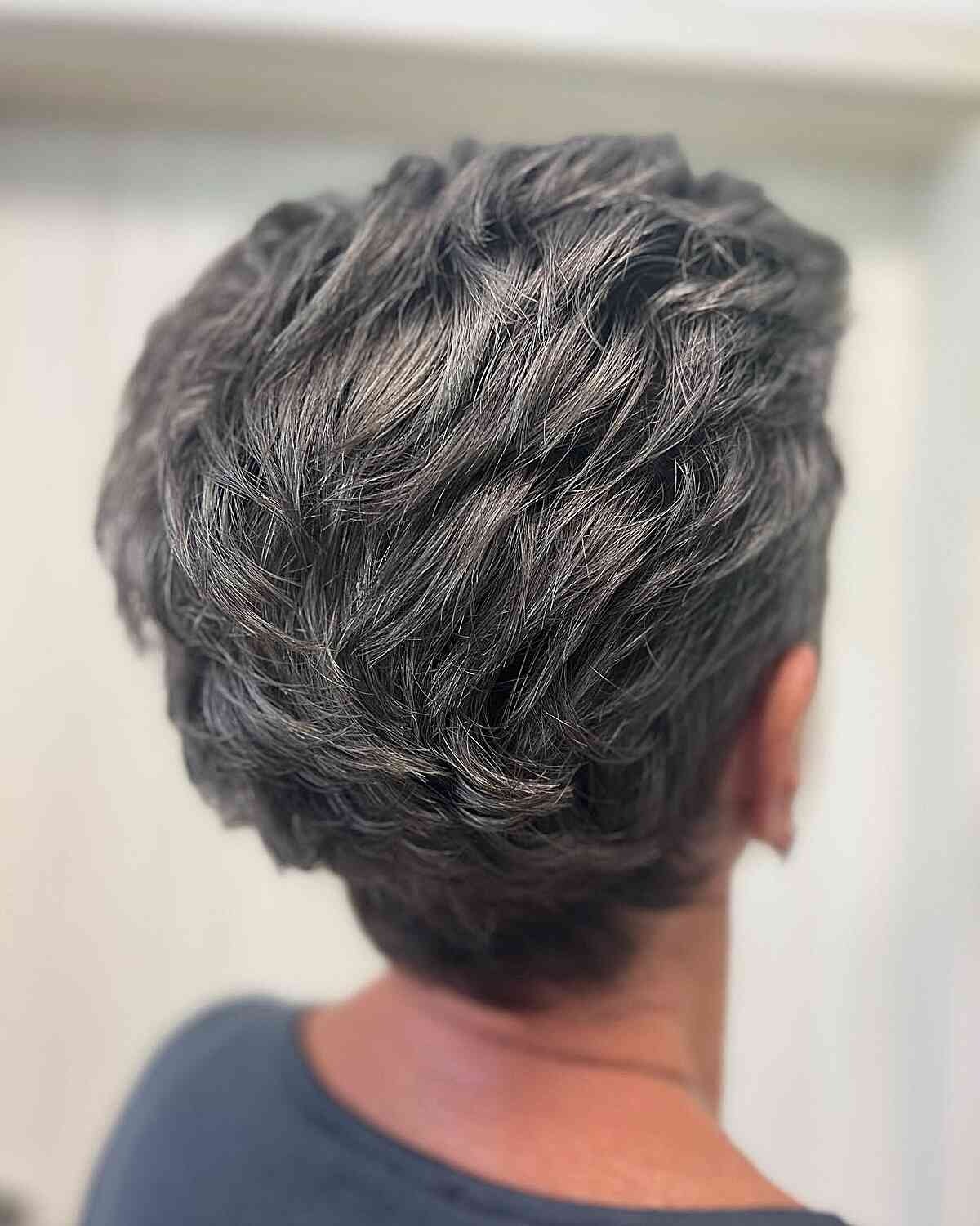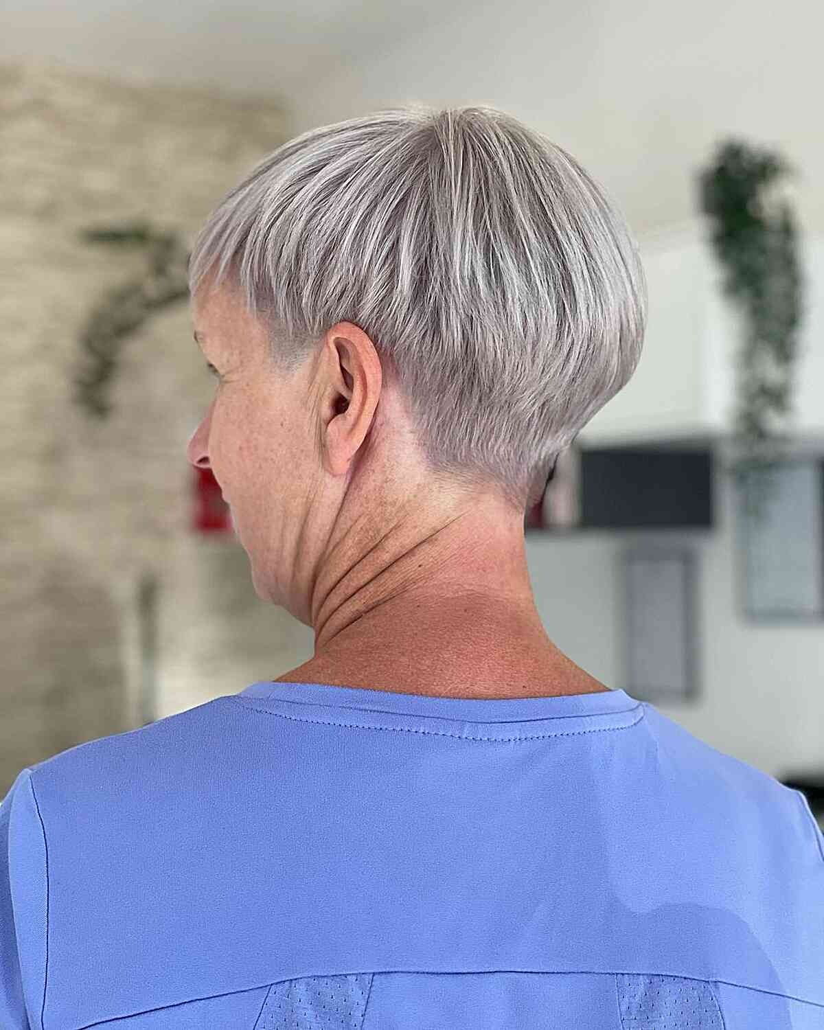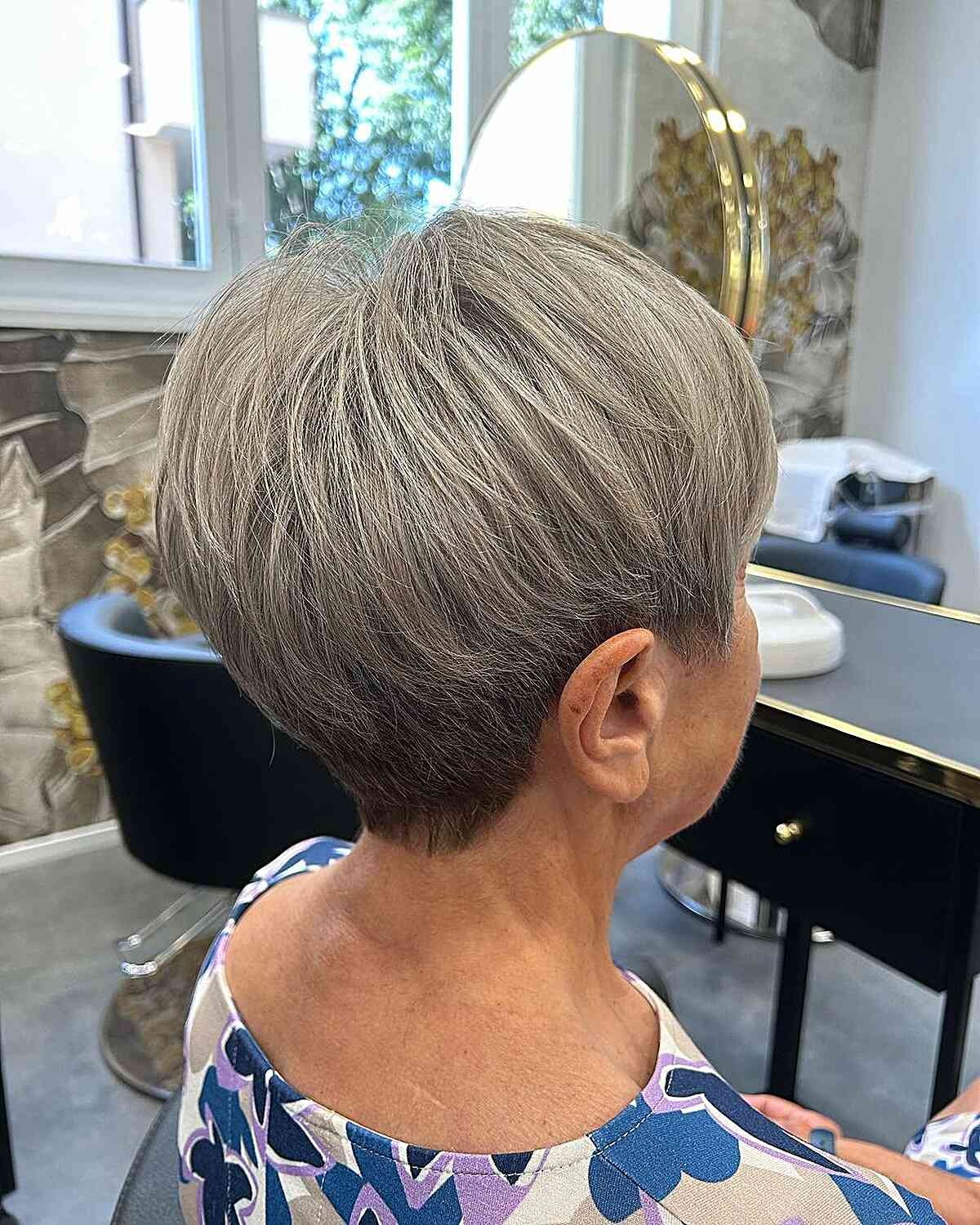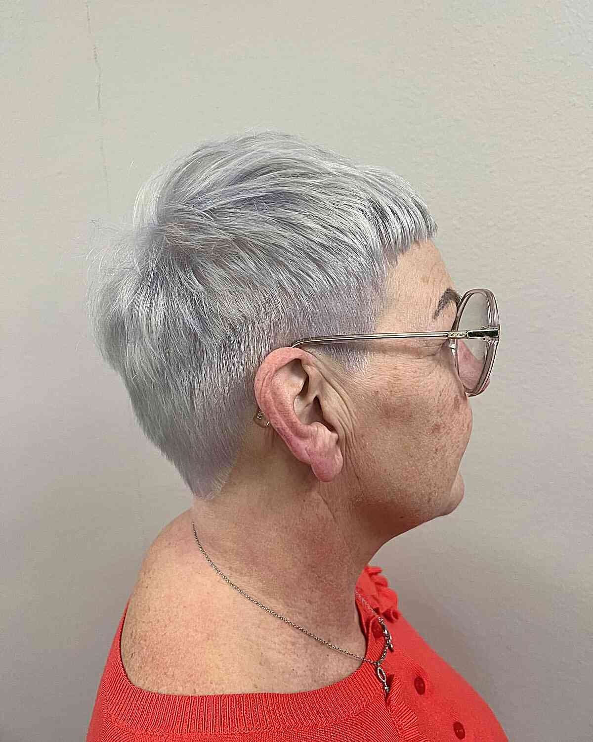 For older women with a short layered hairstyle like a tapered pixie, opting for a silver-gray shade can be a wonderful choice. Elevating the appearance of gray hair becomes straightforward with the use of delicate highlights and proper hair color neutralizers. A skilled hairstylist can expertly incorporate these highlights into your existing gray hair, adjusting the color to achieve the most flattering and natural effect.