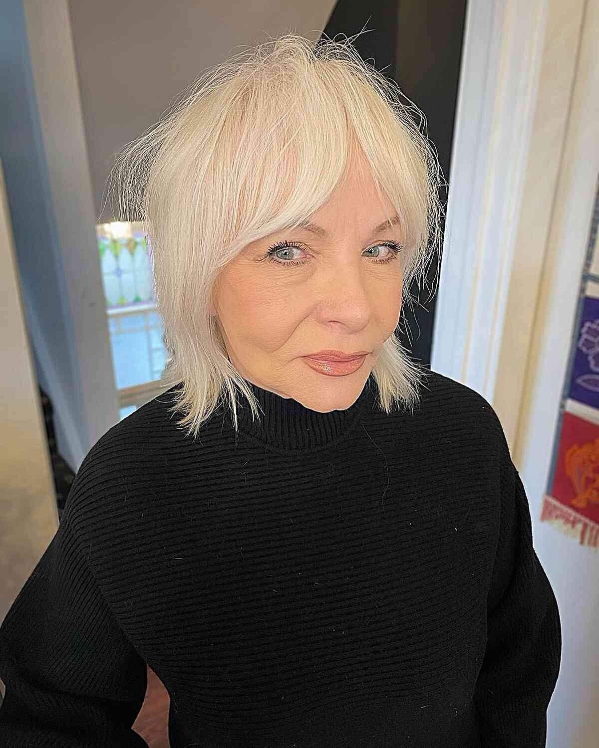 Transforming gray hair into a stylish and creamy white blonde shade can have a rejuvenating effect, making one appear younger. This color choice is soft and flattering, particularly for a mature complexion, and it avoids being too harsh or extravagant. Opting for a raw textured haircut can keep maintenance low while imparting more volume and a fuller appearance to your hair. To finish the style, consider using texture powders or sprays as they won’t weigh down your hair. It’s advisable to steer clear of oil-based products, which can be overly heavy for this type of hairstyle.