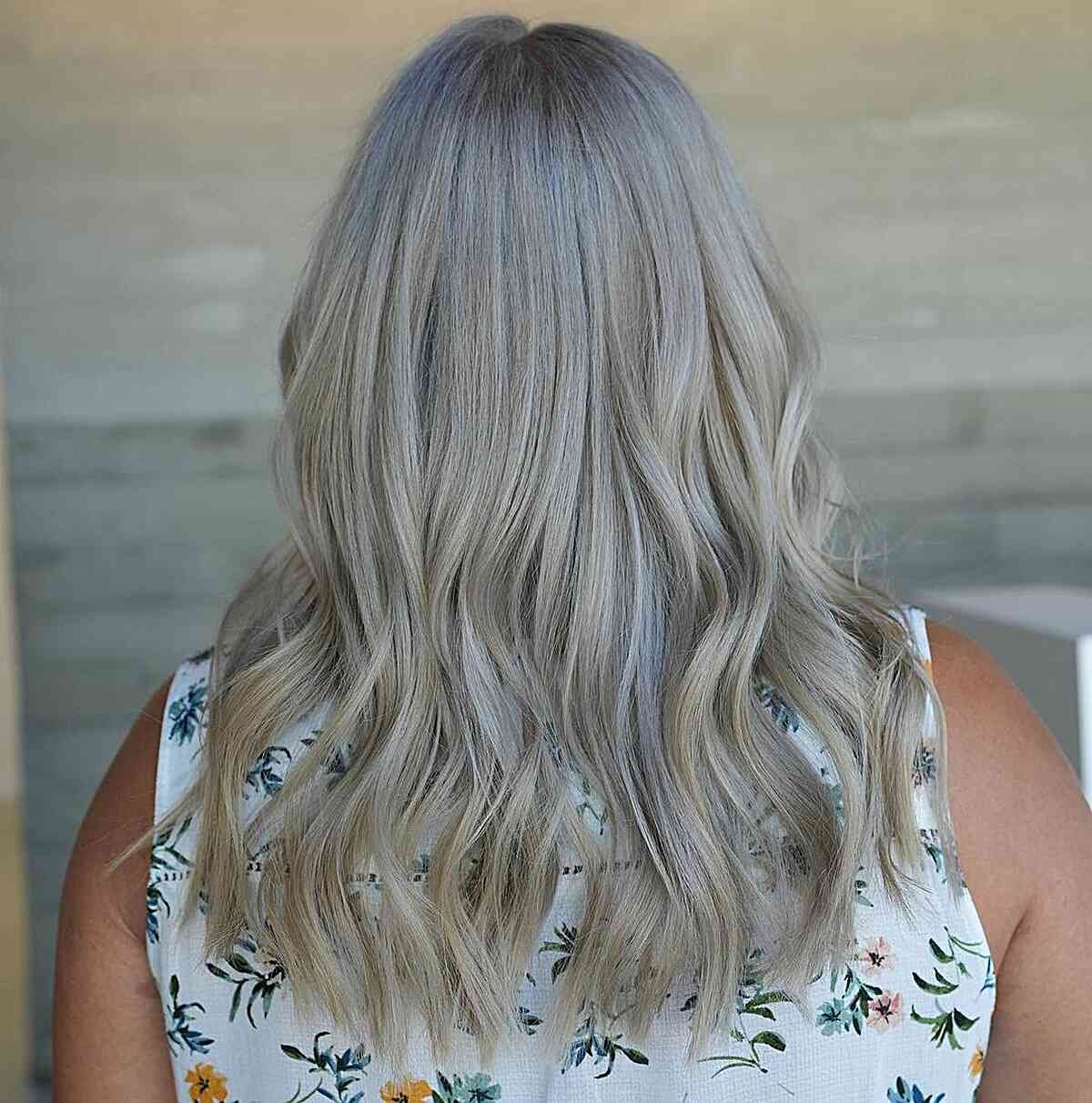 Achieving a gentle blend for your natural white hair is effortless with this style featuring blonde-grey hair and soft waves. Managing and subtly altering the tone of natural gray hair can be a challenge, which is why incorporating soft highlights is a fantastic option. These highlights provide an opportunity to subtly shift the overall hair tone, breathing new life into your natural gray hair. Embrace the beauty of gray hair and elevate it by pairing soft waves with the right color contrast, creating a fresh and stylish look.