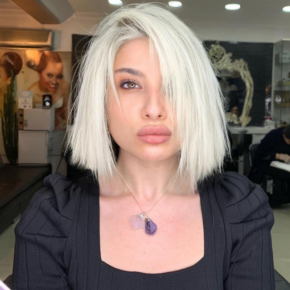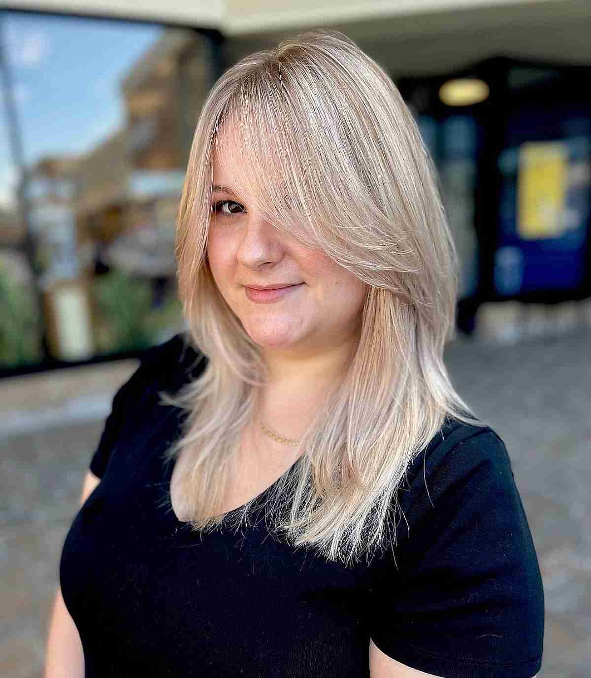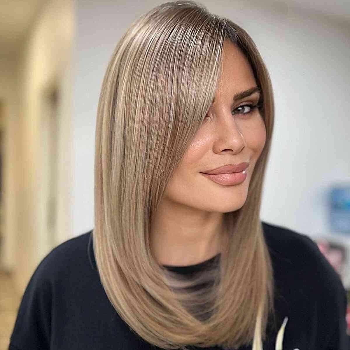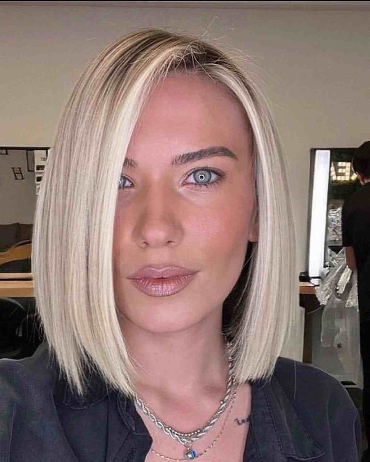 Embrace the trend of the season with a chic deep side part adorning a sleek, straight blonde lob. This contemporary style is all the rage, offering a fresh and fashionable appeal. The key to staying on trend lies in the sharp, clean lines that define this look, making it a must-have for fashion enthusiasts. Whether it’s a bleach-blonde lob or bob, these sharp styles exude sophistication and elegance. Opting for this classy and sleek hairstyle ensures you make a bold statement, capturing attention effortlessly.
