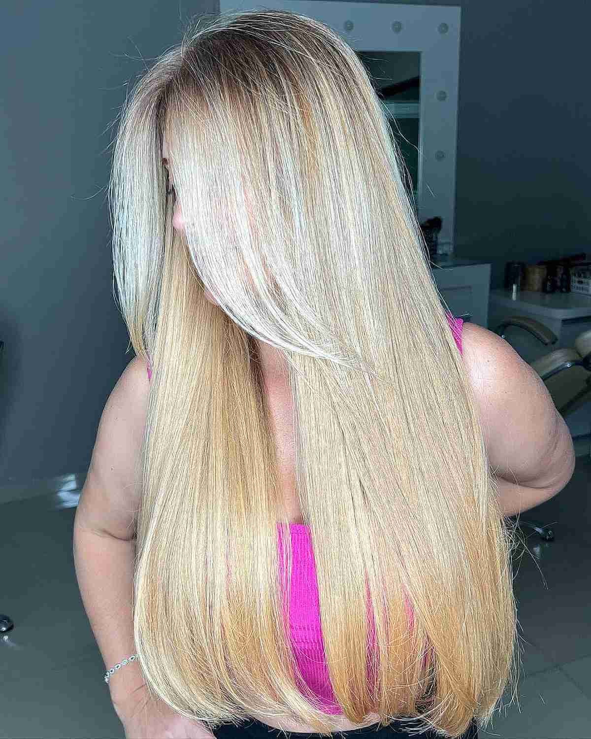 Elevate your style with the contemporary allure of shadow-rooted blonde highlights gracefully adorning extra long locks. The charm of this trend lies in the seamless transition between natural roots and the vibrant blonde hues, creating an exquisite visual contrast. The beauty of full head blonde highlights on long hair is undeniable, offering a captivating interplay of brightness and depth. For those who often tie their hair in a ponytail, opting for a comprehensive highlight ensures a uniform blonde tone, preventing any noticeable dark patches when the hair is gathered. To maintain this dazzling blonde effect, it’s unnecessary to undergo a complete highlight process with every salon visit. Instead, consider scheduling a partial highlight session approximately 6 to 8 weeks after a full highlight, maintaining the luster and brilliance of your blonde. Additionally, incorporating color glaze appointments in between highlighting sessions will guarantee your blonde remains radiant and glossy, adding a touch of sophistication to your overall look.