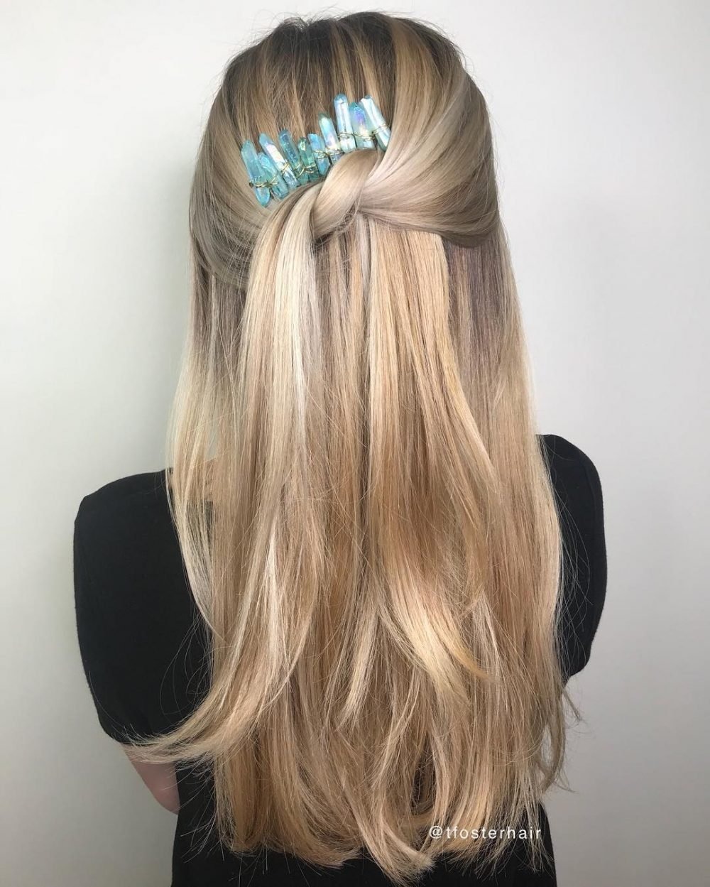 Create an elegant half updo effortlessly by pulling sections of hair from each side into a loose knot, offering a simple yet stunning option, especially for weddings. Enhance the charm by adorning the knot with a lovely hair gem, adding embellishment and extra security. Recreating this quick half updo for straight hair is a breeze, ensuring a chic and effortless look. Elevate your style further by giving your locks a delightful shade of champagne blonde, transforming your hair from mundane to magnificent.