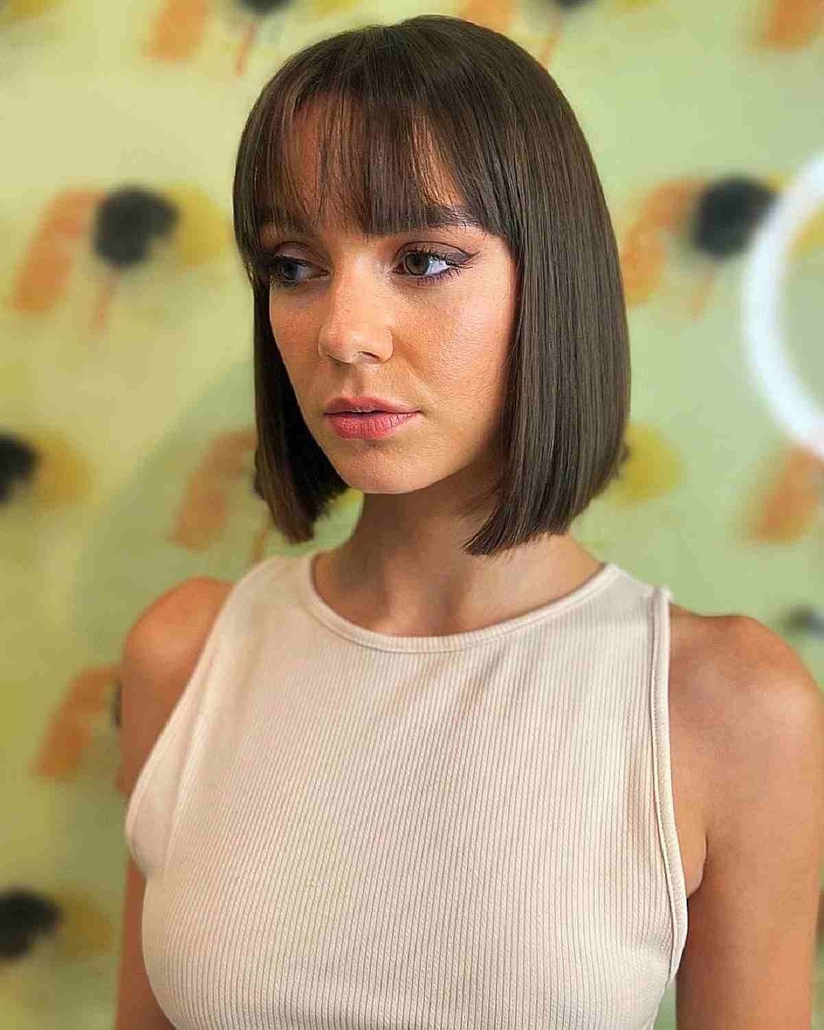 Embrace the allure of a stunning straight blunt bob with blunt bangs, a style far from simple. The sharp, uniform length emphasizes the weight of the edges, creating a powerful visual impact. Introducing a blunt fringe further enhances the hairstyle for women with straight hair, framing the face with precision and sophistication.