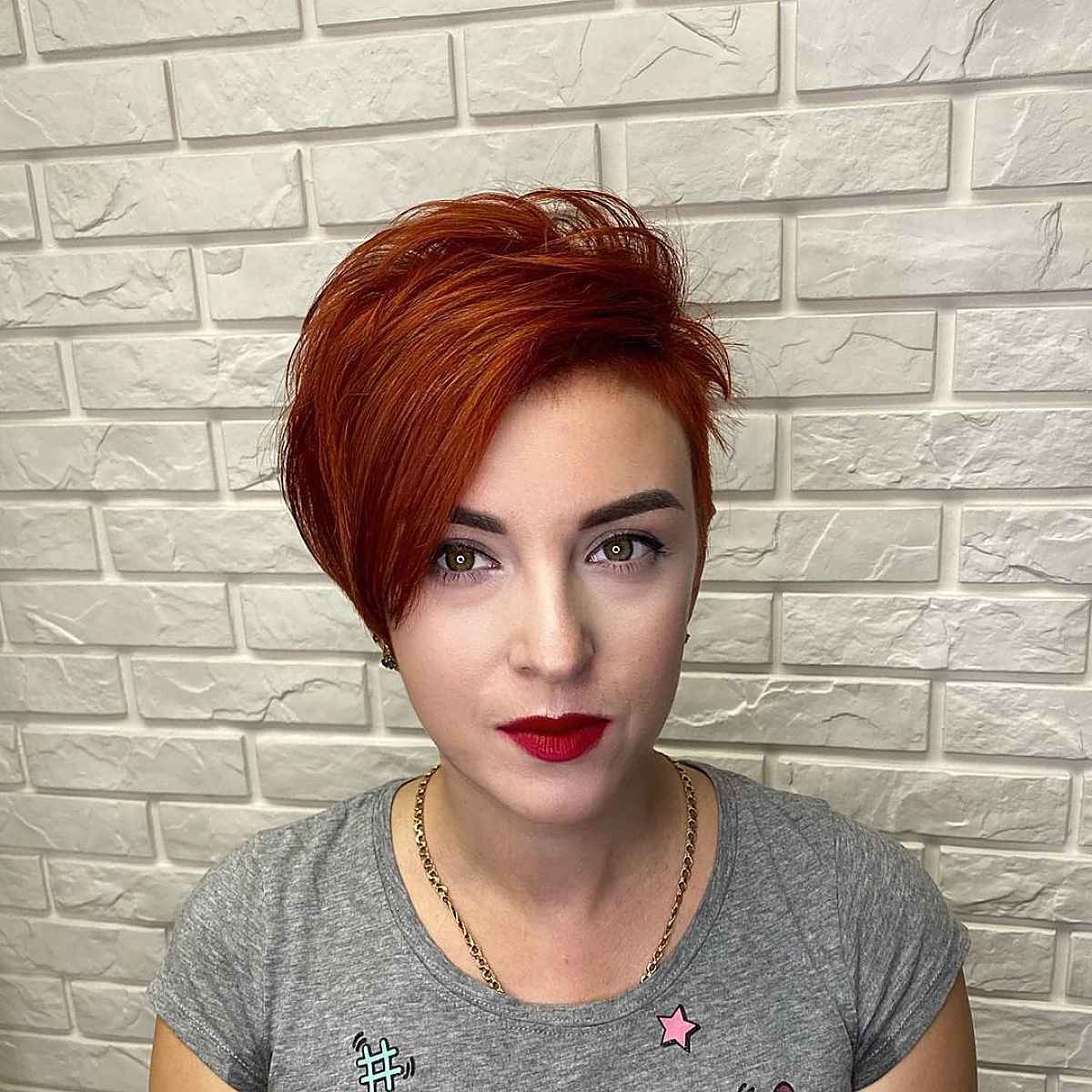 Embrace a voluminous style with the asymmetrical pixie bob tailored for short straight hair, perfectly complementing your natural glam. Elevate the look with a luscious dark red shade for added allure. This short side-swept cut is particularly flattering for individuals with oval, square, diamond, or heart-shaped faces and short hair, ensuring a chic and stylish appearance.