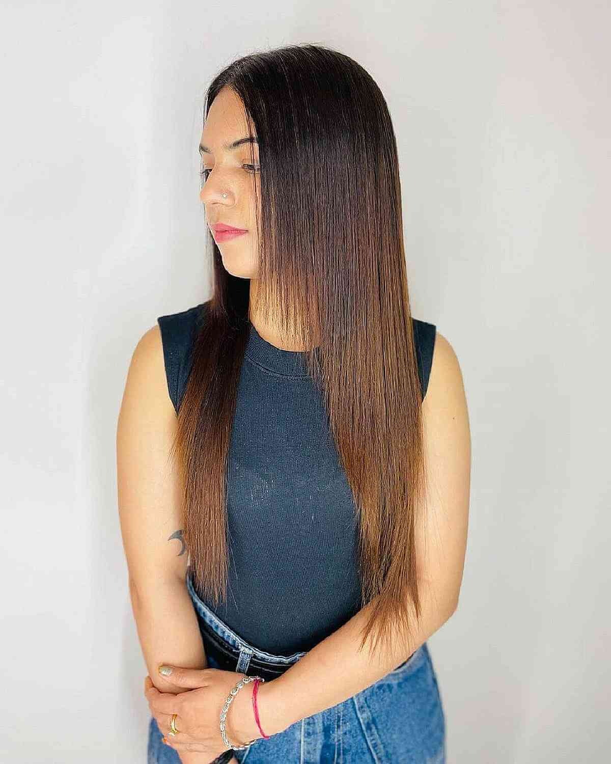 Indulge in the elegance of a sleek and straight long hair cut, adorned with a chic balayage. This polished look, featuring a center part, exudes sophistication and effortless style. With its low-maintenance appeal, sleek straight hair is a timeless choice. While easy to recreate, the right products and techniques are essential to achieving the perfect result.