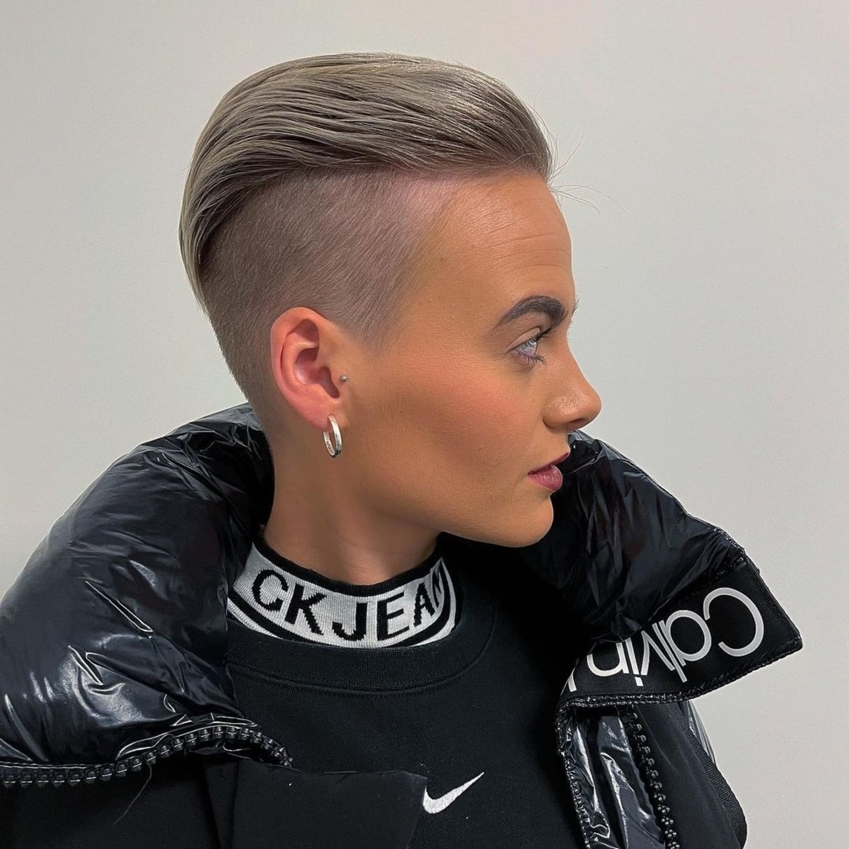 Embrace an edgy pompadour style for women, exuding a cool vibe that adds height to shorter hair. Featuring disconnected lengths on top, pulled up and back, this style creates heightened volume and lifts all your hair off your face, offering a chic and lifted feel regardless of how short you choose to go on the sides.