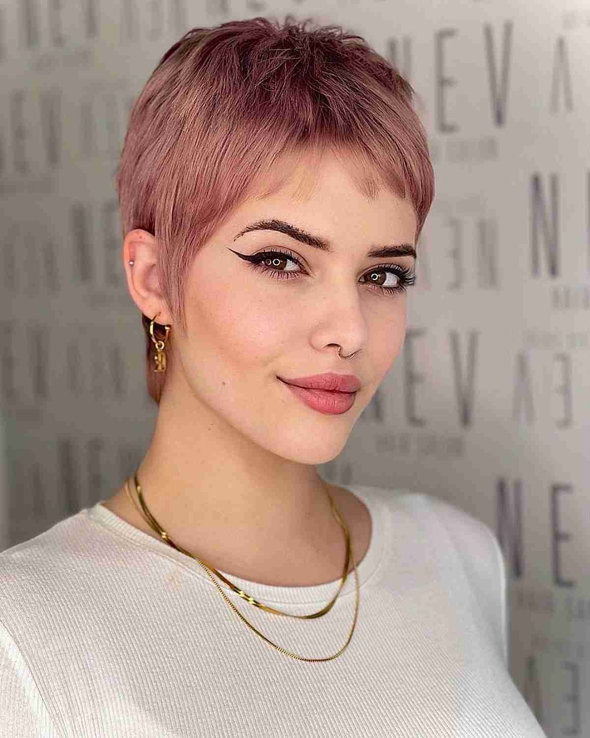 Achieve an awesome look with a pink pixie cut that never fails to impress. To enhance this trendy cut, focus on incorporating ample texturizing techniques, ensuring the hair falls into place effortlessly. Style the pixie with a wax or pomade to achieve a cool and edgy appearance, adding the perfect finishing touch to this bold and fashionable choice.