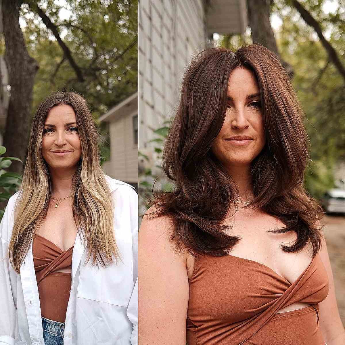 Revitalize the 80s feathering haircut with a vibrant blonde shade, elevating its retro charm. Accentuate the feathered layers by styling your locks with subtle texture, showcasing its chic appeal. This option not only adds movement to fine, straight hair but also reduces weight from the hair’s surface, enhancing its overall allure. When prepping this feather cut for long hair, a mousse works wonders, ensuring your hair achieves the desired volume and texture.