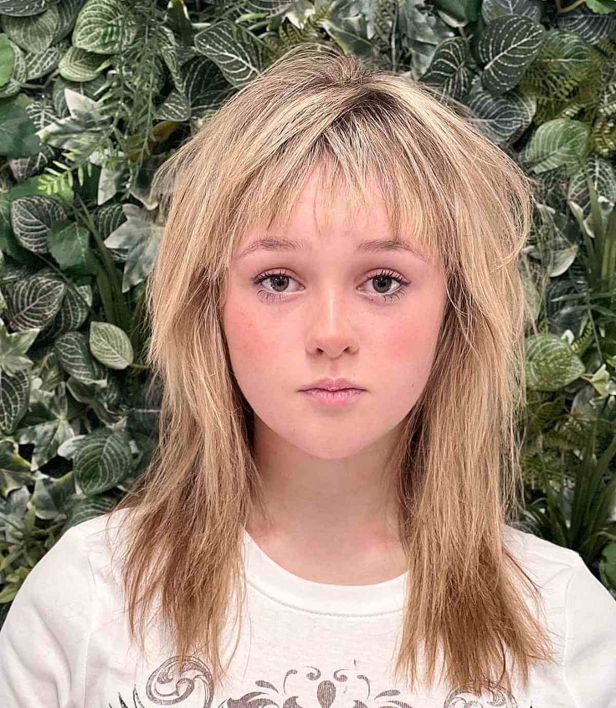 Embrace exceptional flair with a medium-length straight shag featuring bangs, a style that exudes effortless chic. Perfectly tousling the back area adds a touch of distinction, enhancing the overall appeal. The light strawberry blonde tone lends a softer finish to this hairstyle, creating a harmonious blend of elegance and trendiness. This haircut stands out as the best choice for straight medium-length hair, offering a must-try look that captures attention and leaves a lasting impression.