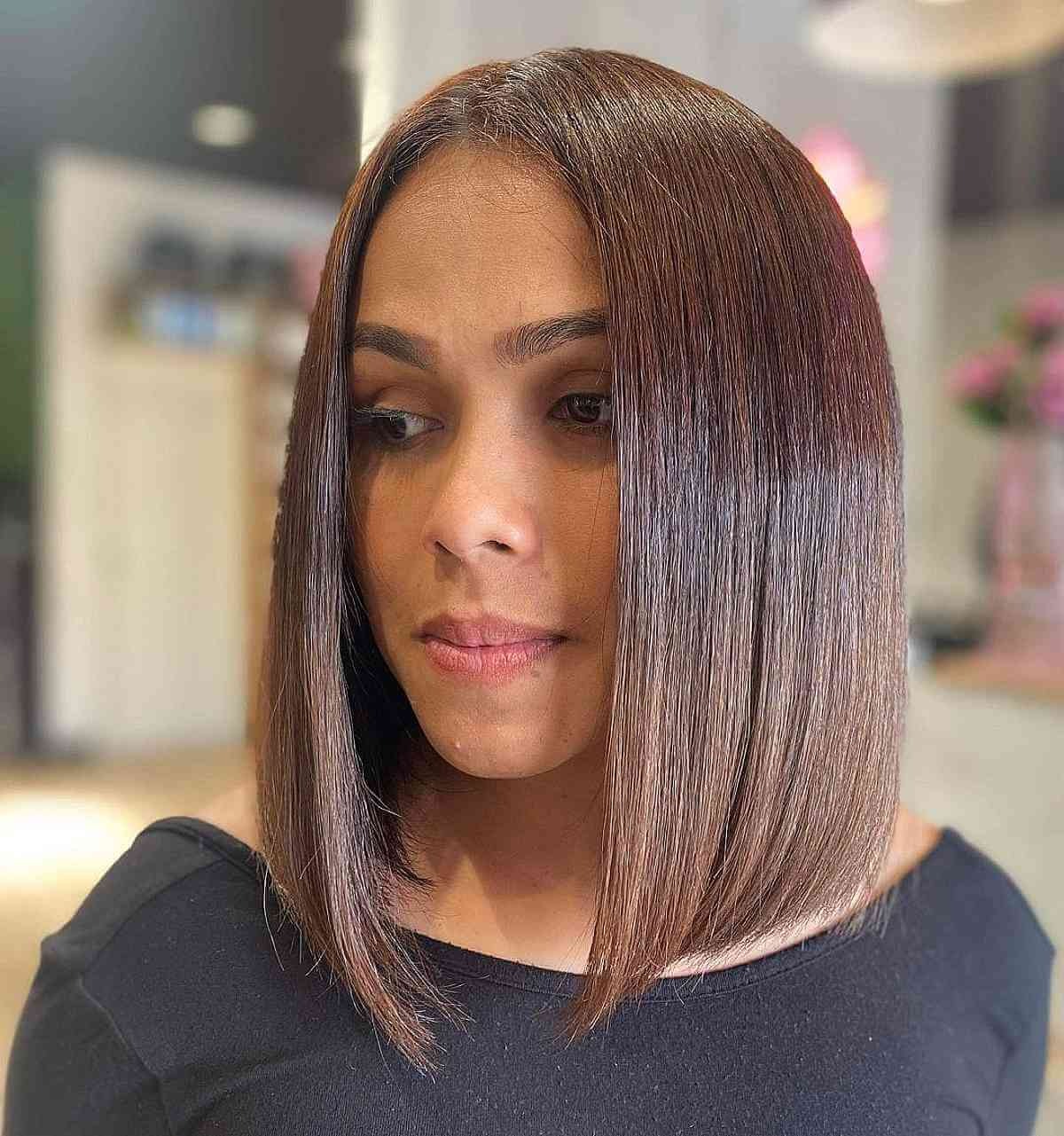 Elevate your look with the sophistication of a straight asymmetrical haircut. This style exudes modern elegance, featuring sleek lines and a distinctive edge. The allure lies in the subtle asymmetry, where one side gracefully extends slightly longer than the other, creating a captivating visual contrast. If your hair naturally parts on the side, the longer length enhances the weightier side of the part, resulting in a chic and jaw-slimming effect. This asymmetrical bob is not only elegant but also versatile, seamlessly transitioning from casual outings to formal events with ease, making it a perfect choice for various occasions.