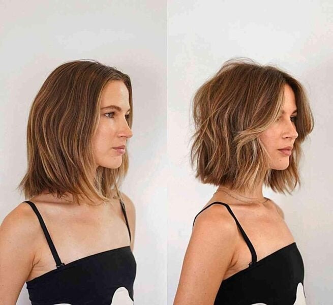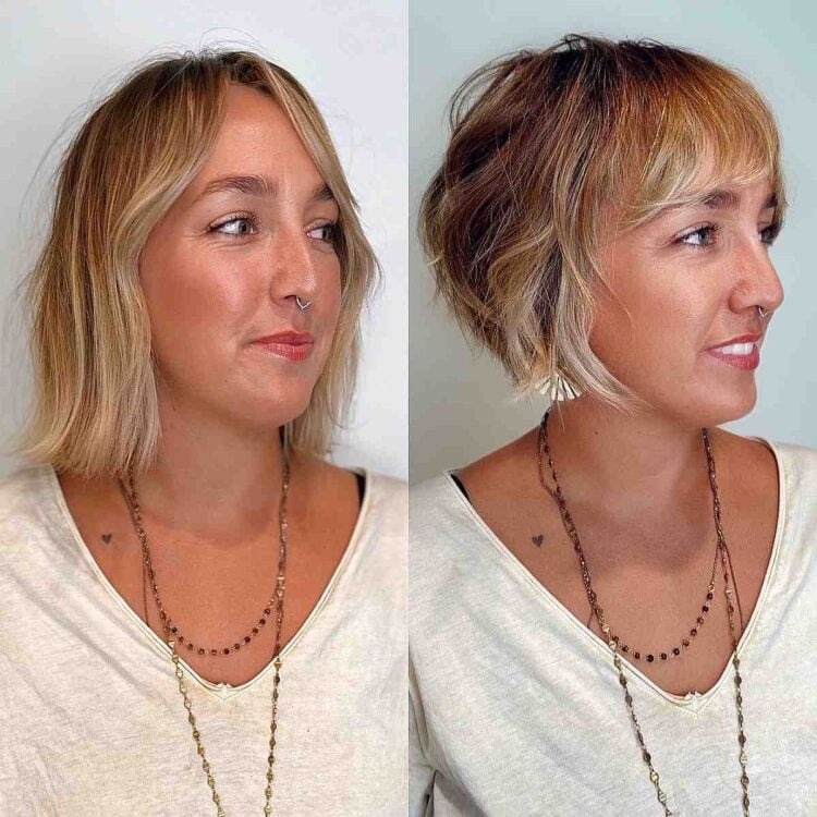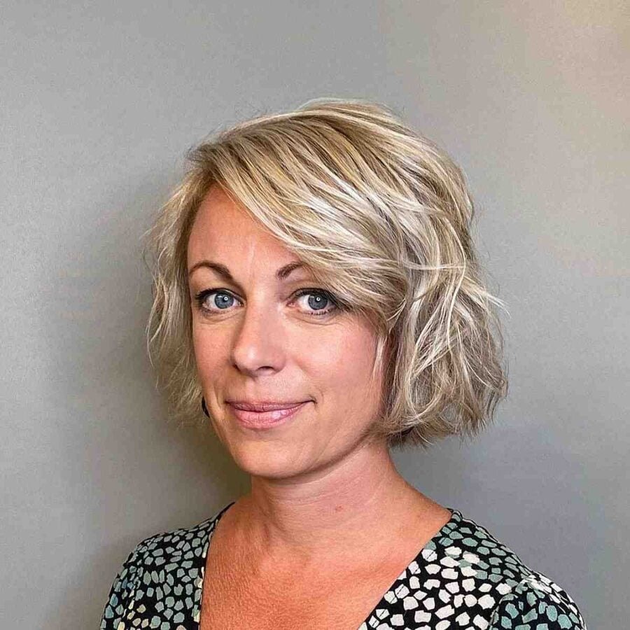Hair color plays a significant role in accentuating or softening your facial features. Consider adding a blonde balayage during your next salon appointment to complement your unique features. A layered bob, when styled tousled and messy, exudes effortless charm. Pairing it with bangs adds a touch of polish to the overall look. Combining this color technique with the right haircut creates a modern yet lived-in style that perfectly suits your individuality.