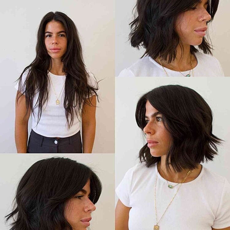 Description: Transforming your dark locks into a chic statement doesn’t always require dyeing; a short disheveled bob can instantly elevate your style! Effortless waves and root volume infuse a laid-back vibe into your haircut, while a wispy fringe brings a touch of allure to the overall look.