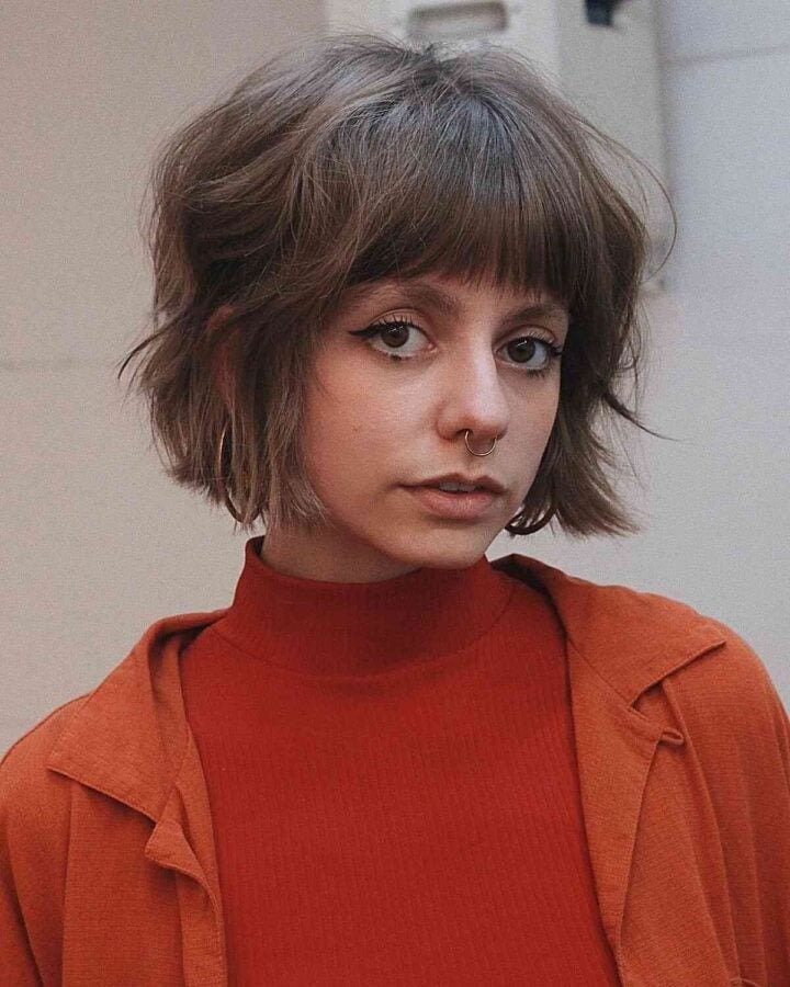 For women seeking a punk-inspired flair, this choppy textured bob with bangs is an ideal choice. The choppy layers infuse dynamism and edge into the hairstyle, providing movement and volume. Bangs make a bold statement by framing the face and accentuating facial features. This style is most suited for straight or slightly wavy hair, as the choppy layers and bangs add texture and dimension to the overall look.