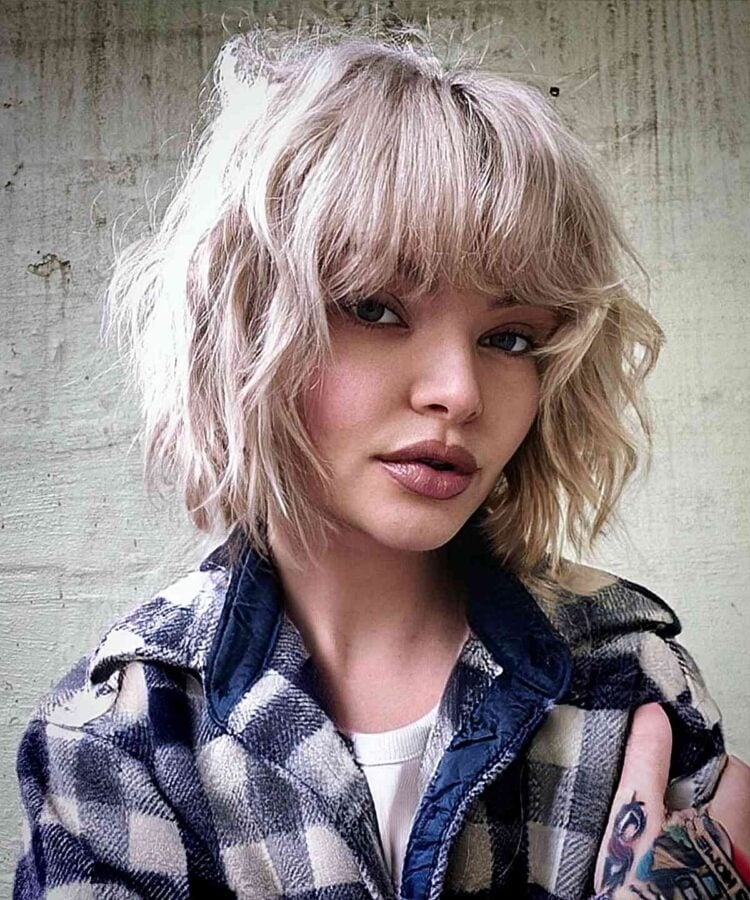 If you’re in search of a low-maintenance haircut, consider opting for a platinum bob with bangs. This style exudes a natural and effortless charm that demands minimal upkeep. When requesting the platinum color, aim for a modern and fresh shade. The textured layers incorporated into the cut enhance depth and movement, adding further dimension to your look.
