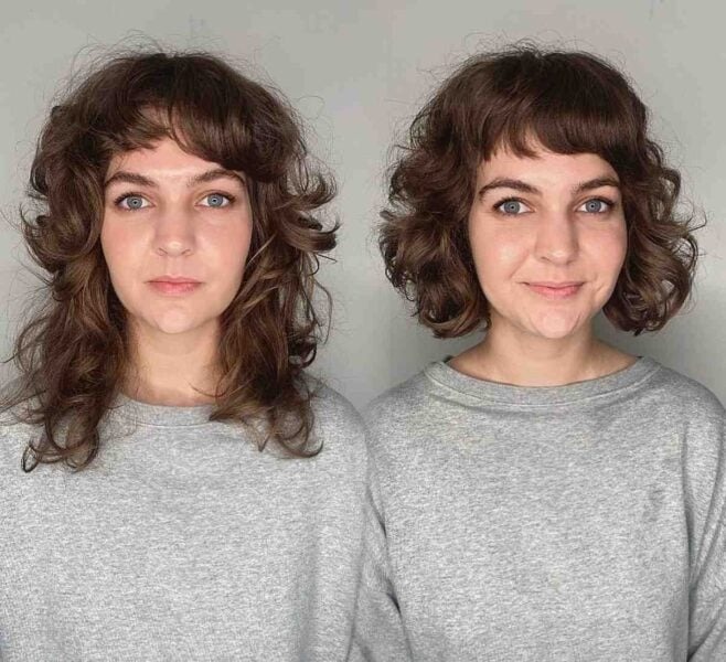 Effortlessly chic, the French curly bob with a fringe exudes a relaxed and feminine vibe. Request jaw-skimming sides and eyebrow-length bangs to achieve a cute and flattering look, particularly ideal for petite features. Enhance volume by applying a volumizing spray, and use a diffuser during drying to maintain the undone feel, adding to the overall charm of the style.
