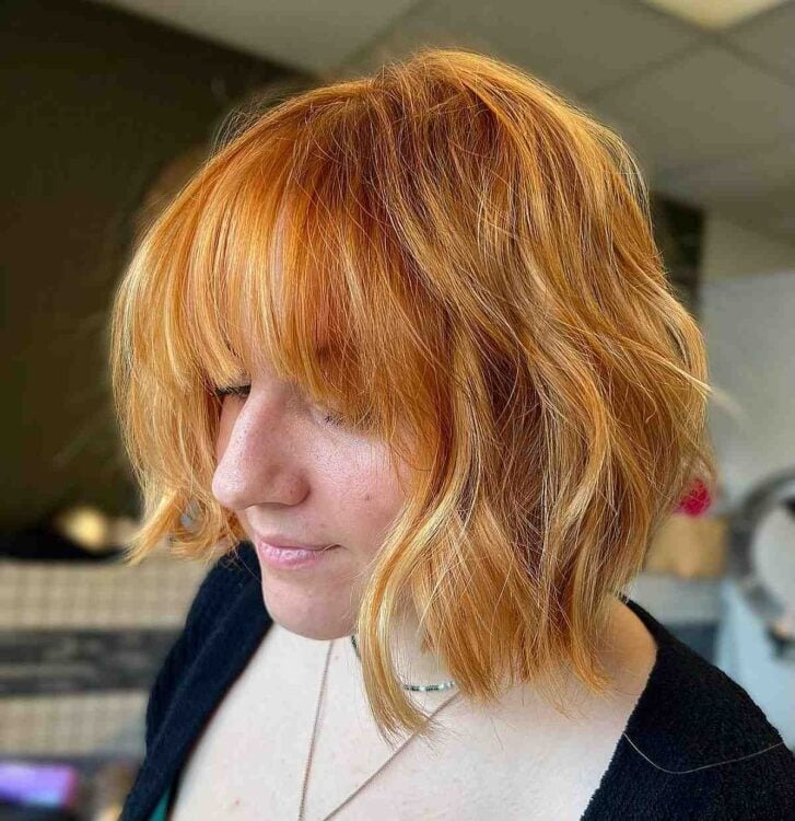 Elevate your style with a trendy chin-length textured bob featuring bangs. Request a shape that is shorter at the back and gradually drops at the front for added dimension. Ask your stylist to incorporate long layers to enhance volume, and consider leaving some longer bangs for a softer, choppy bob effect. Opting for a light copper blonde hue adds warmth to your complexion while imparting a brightening effect.
